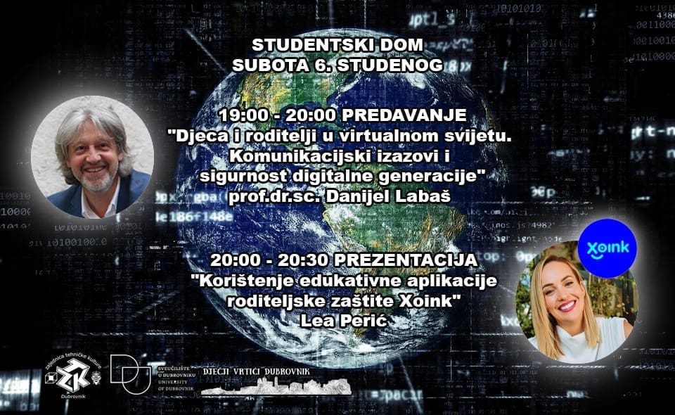 Nakon predavanja profesora Labaša, Lea Perić predstavit će edukativnu aplikaciju roditeljske zaštite Xoink. Ovo predavanje i prezentacija namijenjeni su roditeljima osnovnoškolaca.