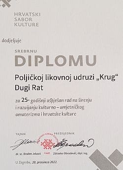 Hrvatski Sabor kulture uručiti će diplome HRSK Krugu i članovima za višegodišnji uspješan rad na širenju i razvijanju kulturno-umjetničkog amaterizma i hrvatske kulture.