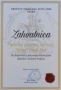 Društvo Poljičana Sveti Jure Priko na Poljičkom stolu 16. prosinca uručilo je PLU Krug Zahvalnicu za doprinos u očuvanju tradicijske baštine i kulture Poljica.