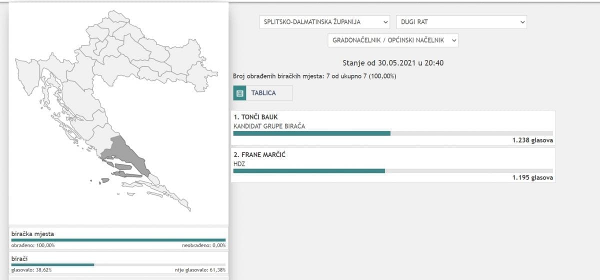 Prema neslužbenim podacima DIP-a, a obrađena su sva biračka mjesta, Dugi Rat će dobiti načelnika koji nije iz redova HDZ-a.