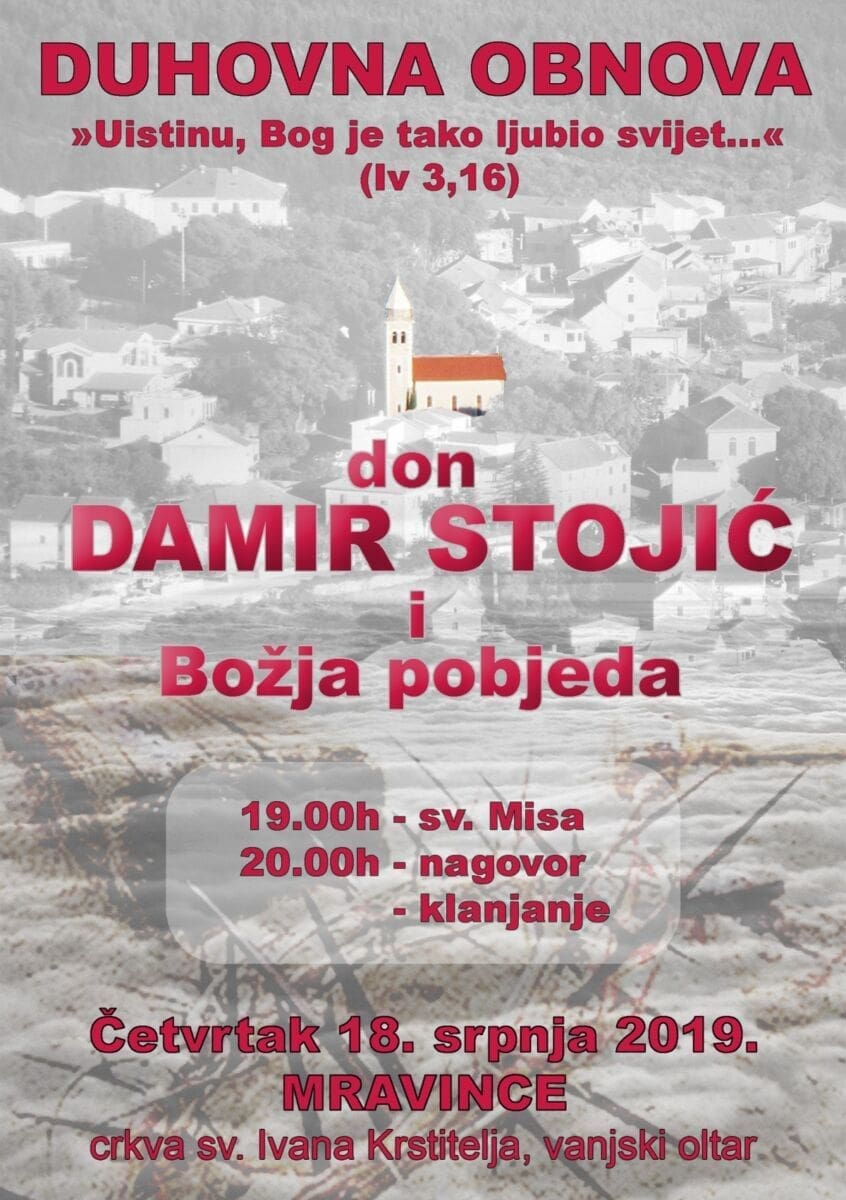 U četvrtak 18. srpnja 2019. održati će se duhovna obnova u Mravincima koju predvodi don Damir Stojić (studentski kapelan iz Zagreba), a pjesmom animira Božja pobjeda iz Zagreba.