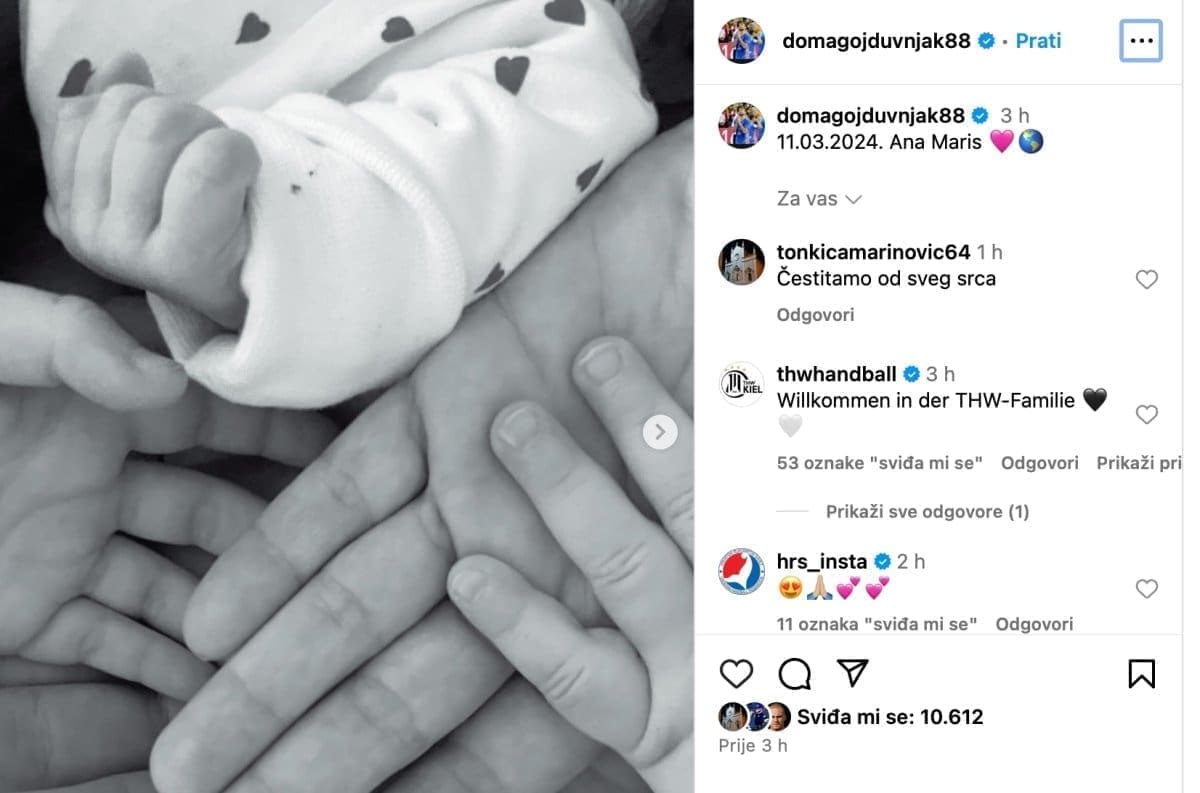 Hrvatski rukometaš Domagoj Duvnjak je nedavno dobio treće dijete, a na Instagramu je podijelio tu predivnu vijest na način koji je već postao prepoznatljiv za njega i njegovu partnericu Luciju. Njihova kćer Ana Maris je stigla, a ponosni roditelji su je predstavili javnosti kroz jednostavnu, ali emotivnu fotografiju - ruke Domagoja, Lucije, njihovih sinova i novorođenčeta. Uz fotografiju, Domagoj je napisao: "11.03.2024. Ana Maris".