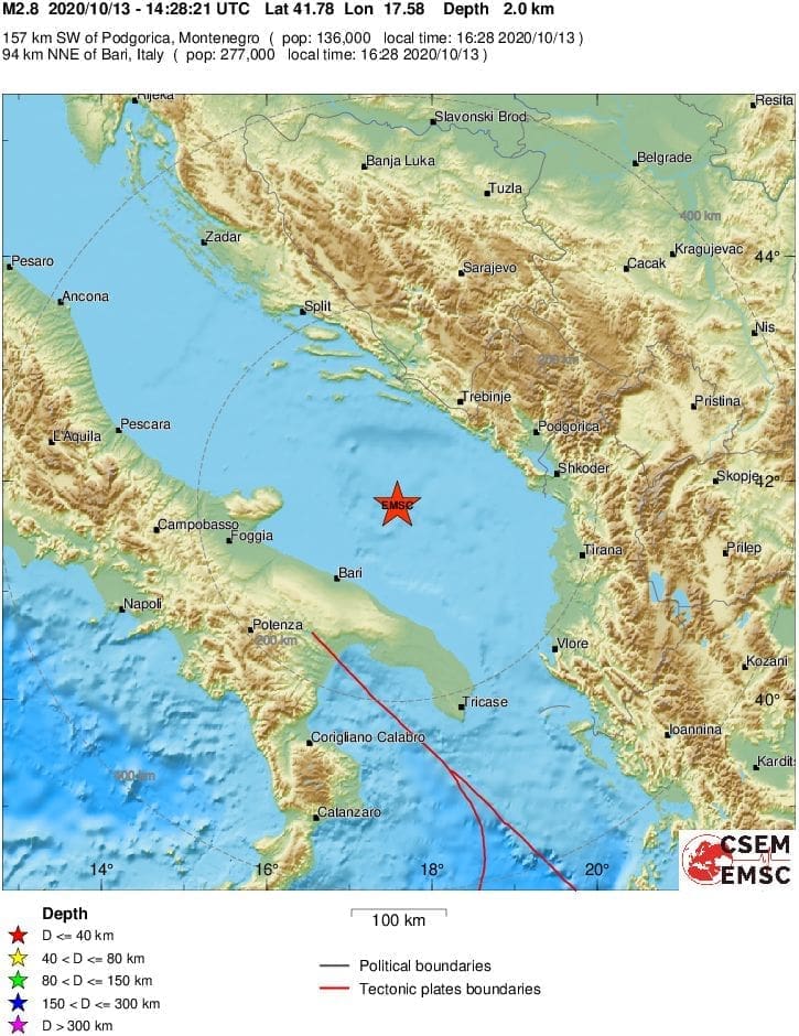 Magnituda potresa bila je 2.8 po Richteru, a epicentar 94 kilometra sjever-sjeveroistočno od Barija.