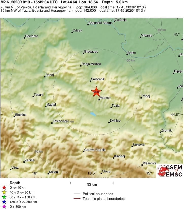 Magnituda mu je bila 2.6 po Richteru, a epicentar 15 kilometara sjeverozapadno od Tuzle.