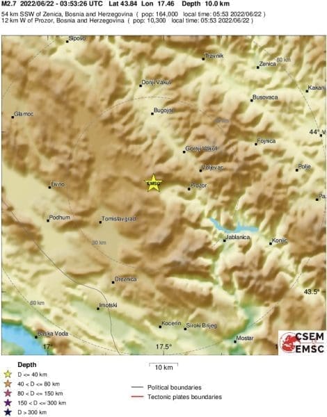 Magnituda mu je bila 2.7 prema Richteru, a epicentar 12 kilometara zapadno od Prozora.