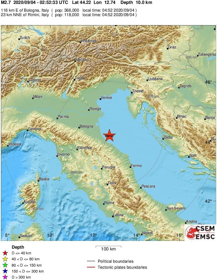 Prema podacima EMSC-a, prvi se dogodio u 2:21 iza ponoći. Magnituda potresa bila je 2.0 po Richteru, a epicentar 39 kilometara sjeverno od Riminija.