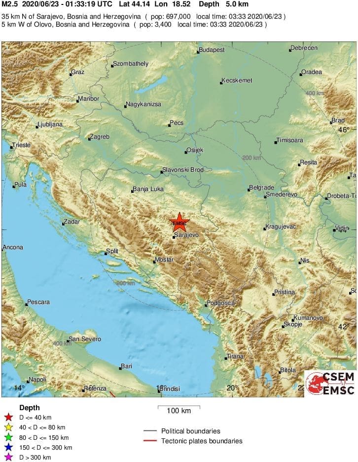 Dva potresa danas su zatresla područje susjedne BiH. Prvi se dogodio u 3 sata i 33 minute iza ponoći. Magnituda je bila 2,5 po Richteru, a epicentar 5 kilometara od Olova.