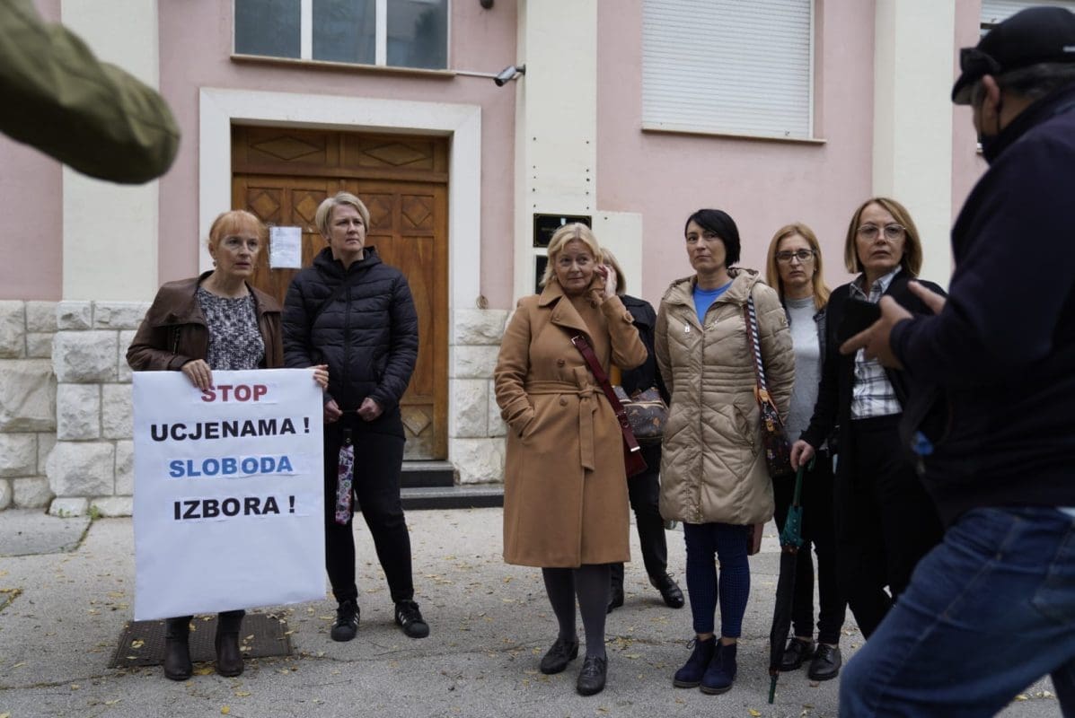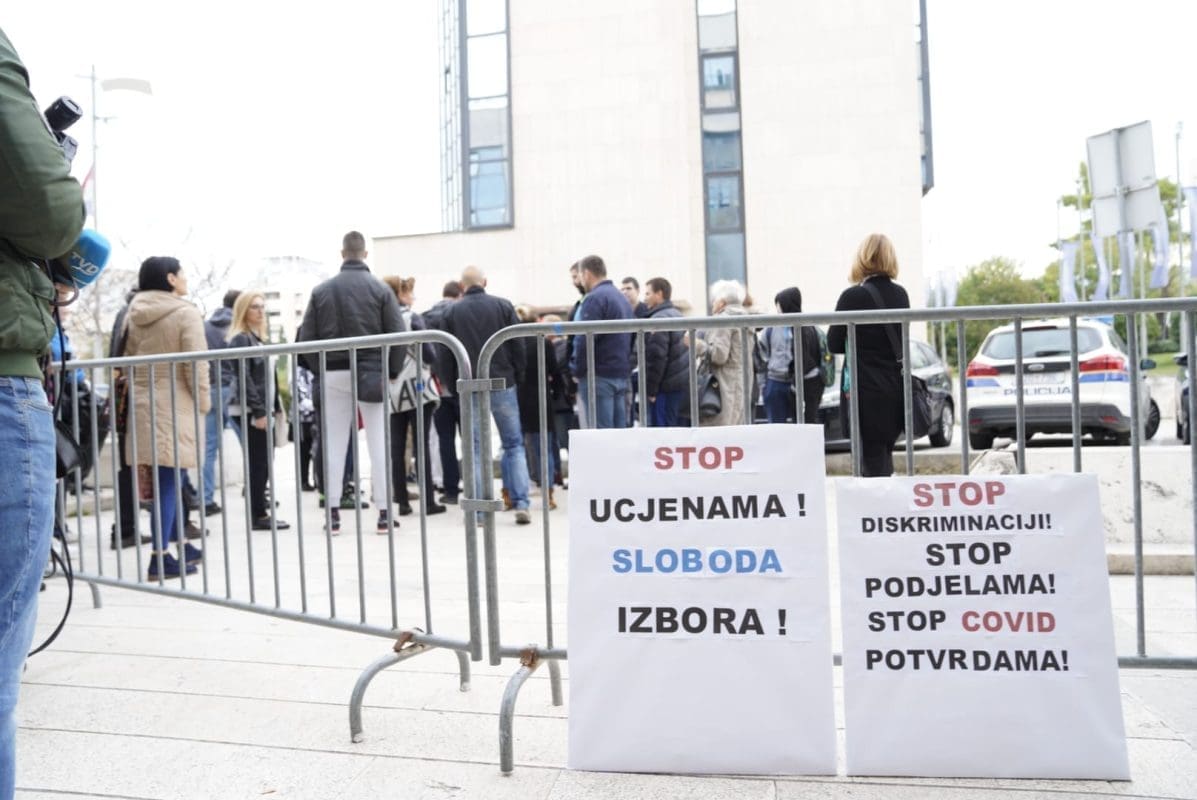 "Mi nismo šačica ravnozemljaša ni antivaksera, nas ima svakakvih, s različitim mišljenjima. Došle smo jutros radit, nismo u prekršaju radne discipline, od nas je zatraženo da pokažemo covid isprave i s obzirom na Ustav RH, Europsku uredbu o zaštiti osobnih podataka, Zakon o zaštiti prava pacijenata, mi smo odbile uvid u našu medicinsku dokumentaciju. Radi toga su naši nadređeni bili prisliljeni, s obzirom na ovu vrlo upitnu i sumnjivu odluku vrlo sumnjivog stožera, bili su nas prisiljeni udaljiti s naših radnih mjesta. Mi ovdje stojimo u znak prosvjeda i našeg velikoga NE na sve ovo što se događa u ovoj državi u kojoj su ljudi krvarili, dali živote, zdravlje, izgubili članove svoje obitelji. Jednostavno nam moral i savjest ne dozvoljavaju da se sagnemo i da pristanemo na protuustavno i protupravno ponašanje prema dijelu građana koji ima pravo na svoje mišljenje i koje se sada pretvara u građane drugoga reda, a pomalo i trećega reda", kazala nam je Višnja Rakić. upraviteljica zajedničke sudske pisarnice na Trgovačkom sudu u Splitu.