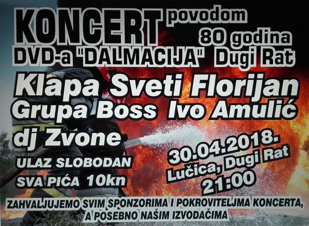 DVD "Dalmacija" Dugi Rat 30. travnja slavi 80 godina postojanja. Tom prilikom organiziraju koncert na kojem će nastupiti Klapa Sveti Florijan, grupa Boss, Ivo Amulić i DJ Zvone.