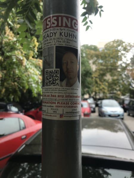 A okolnosti nestanka tada 47-godišnjaka ne pomažu istražiteljima te rodbini – sve pretpostavke su još uvijek moguće, od toga da je žrtva kaznenog djela, preko nesretnog slučaja do namjernog 'nestanka' s lica planete. Kuhn, rođen u Latviji 1973. godine, s prijavljenim prebivalištem u Zurichu u Švicarskoj, s njemačkim i švicarskim državljanstvom, u Hrvatsku je stigao s prijateljima dva tjedna prije nego li je posljednji put viđen. Dobro su se zabavljali, a ekipa je završila godišnji odmor dok je Arkady Kuhn odlučio ostati u Splitu još neko vrijeme. Posljednji put je viđen 11. kolovoza 2020. godine kako u večernjim satima izlazi iz apartmana na području Manuša. Nosio je bijelu majicu, jeans hlače te bijele šlape, natikače sa zelenim logom marke Lacoste – to je snimila sigurnosna kamera nedaleko apartmana.