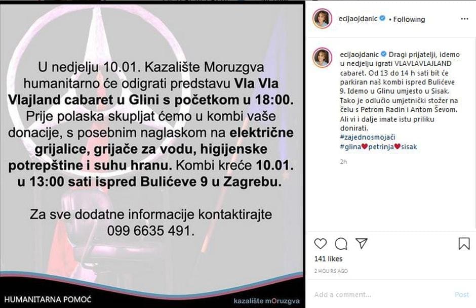 Humanitarna pomoć za stradale u razornim potresima u Baniji i dalje pristiže iz cijele Hrvatske, a pomoć već danima pružaju i brojne domaće zvijezde. Na jedan takav humanitarni potez odlučila se i glumica Ecija Ojdanić koja je odlučila zajedno s kazalištem Moruzgva razvedriti stanovnike pogođenih područja. - Dragi prijatelji, idemo u nedjelju igrati VLAVLAVLAJLAND cabaret. Od 13 do 14 h sati bit će parkiran naš kombi ispred Bulićeve 9. Idemo u Glinu umjesto u Sisak.