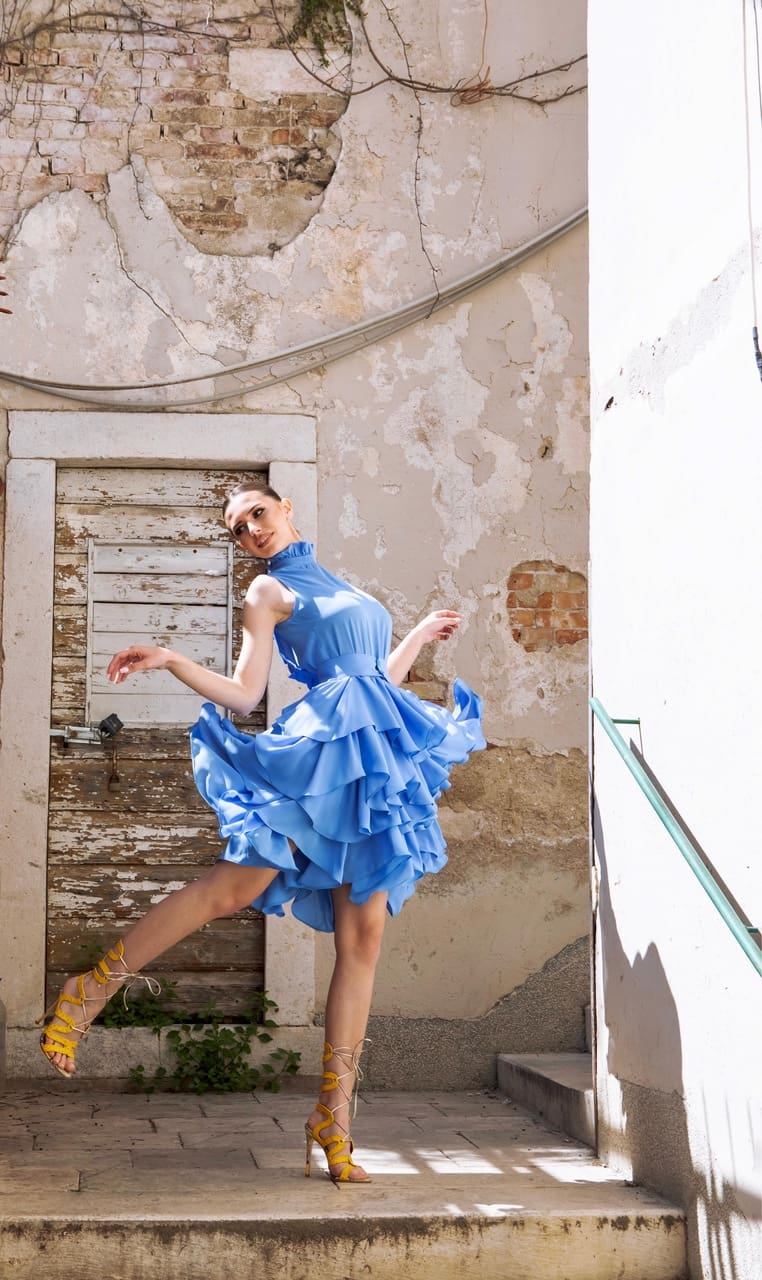 La Transition objedinjuje oba izraza: gornji dio u bež tonu prelazi u plavi donji segment, dok bogato oblikovan ovratnik dodatno naglašava prijelaz, stvarajući vizualno i konceptualno središte kolekcije. Haljina koja priča o promjeni bez prekida, o kontinuitetu koji je sam po sebi najljepši oblik slobode.
