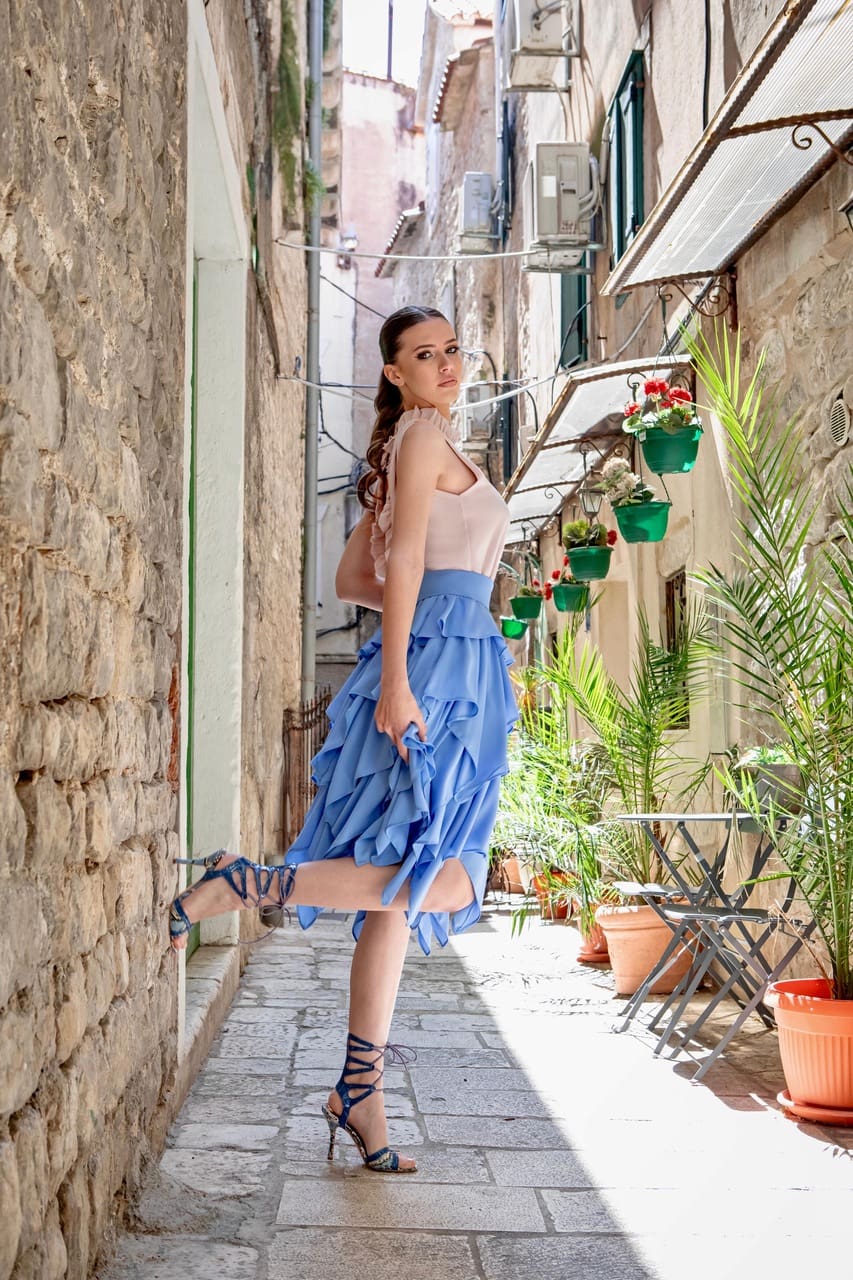 Sandale na petu Alena Ledenka, ručno rađene od najfinije kože, predstavljaju vrhunac zanatske umjetnosti u kojoj svaki šav i linija govore o preciznosti majstora. Elegantna silueta i sofisticirana peta savršeno su upotpunile izgled, naglašavajući snagu, ženstvenost i nepogrešiv stil.
