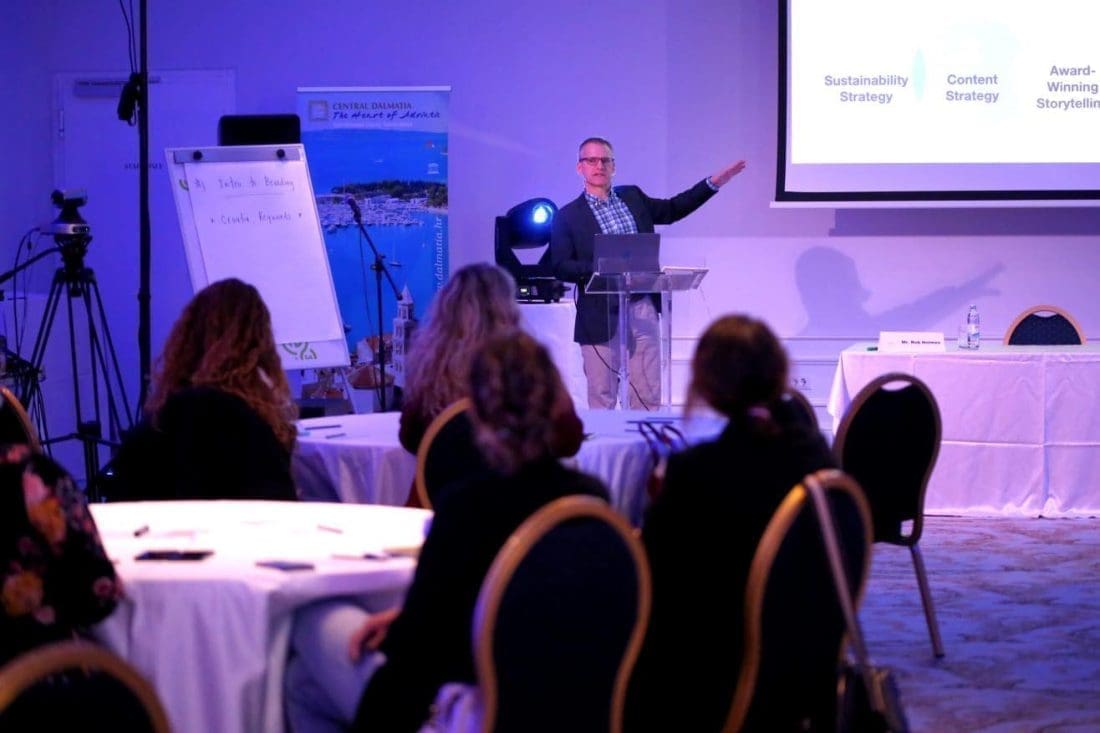 Rob Holmes, ekspert za održivi turizam, održao je današnju radionicu. Sudionici su imali sjajnu priliku upoznati se s inspirativnim primjerima iz stvarnog života, kako bi stekli uvid u najbolje prakse i dobili savjete za izgradnju content marketing strategije. Prema Holmesu, autentično pripovijedanje i održivost treba smjestiti u samo središte programa content marketinga, te imati na umu da se turizam u ove dvije godine dosta promijenio jer ljudi za svoj novac pomno biraju gdje ga žele potrošiti i na koji način.