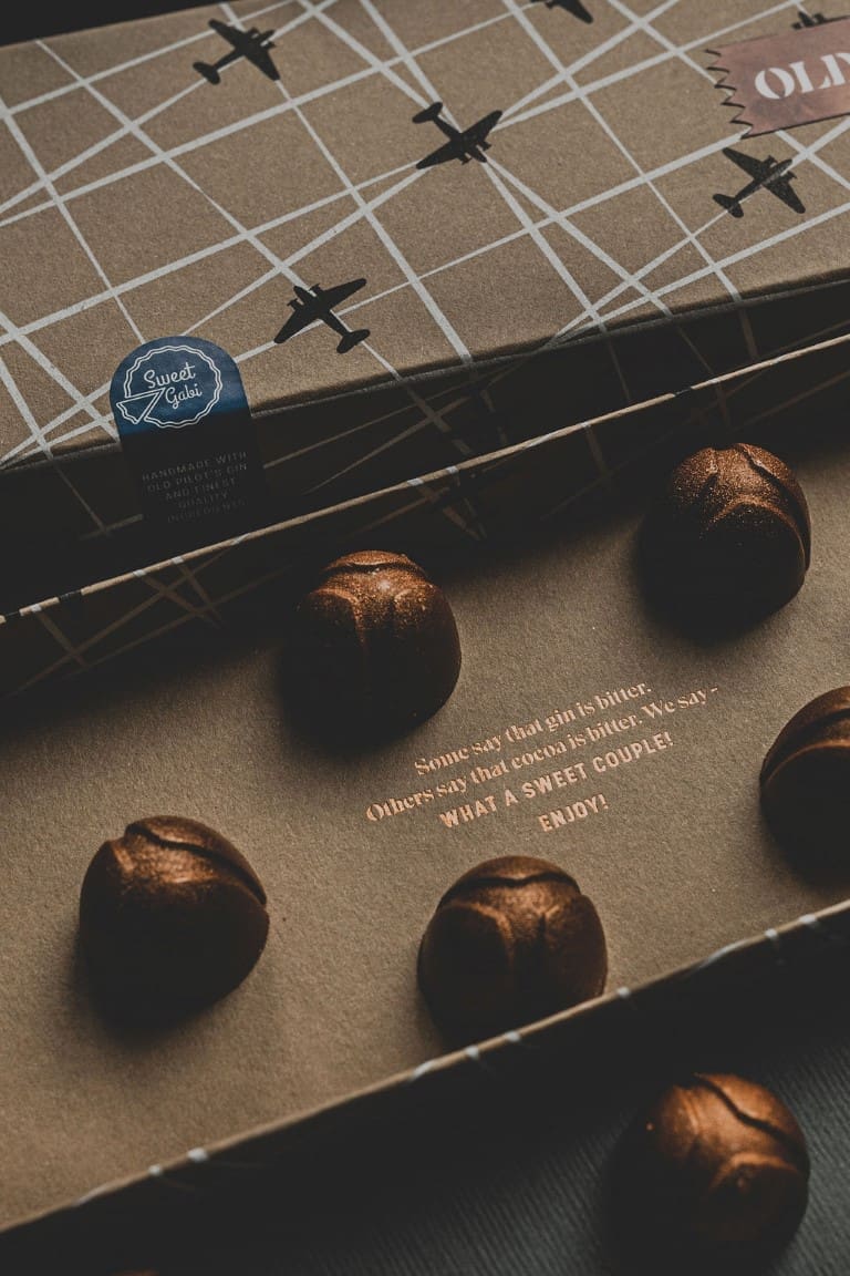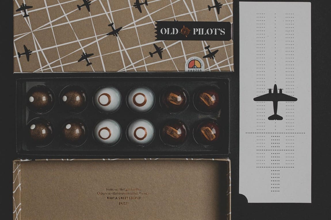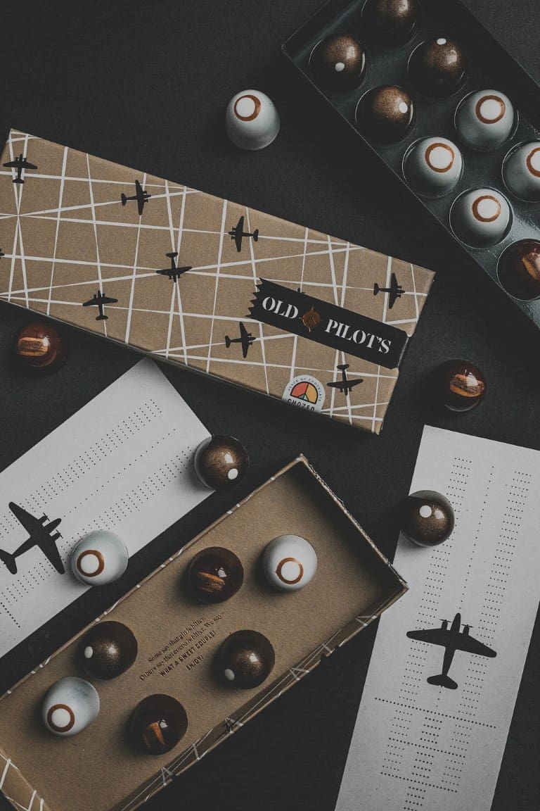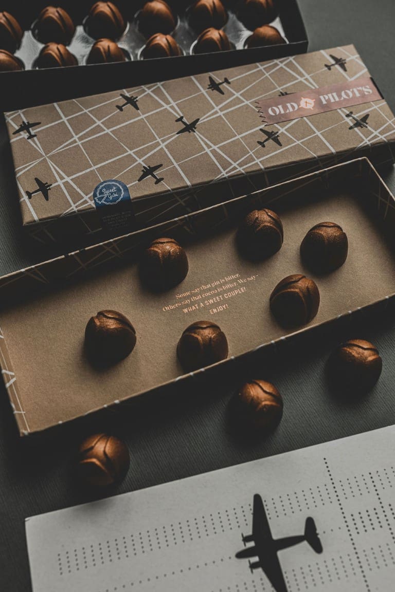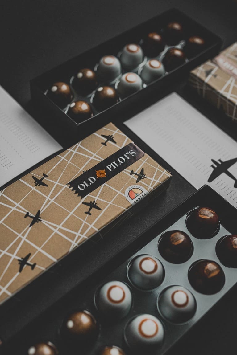 Suradnja Old Pilot's gina i zagrebačke čokoladne radionice Chozen vlasnika Dražena Zeljkovića, rezultirala je savršenim spojem visokokvalitetne čokolade i gina okrunjenog titulom najboljeg gina na svijetu, na najprestižnijem svjetskom natjecanju IWSC, u kategoriji 'London Dry Gin'. U kutijici Old Pilot’s x Chozen pralina nalazi se 12 komada ručno oslikanih, oblikovanih i napunjenih čokoladnih zalogaja. Sama kutija također je vizualno atraktivna sama po sebi, omotana zaštitnim papirom koji na sebi nosi prepoznatljivi znak ovog brenda – avion.