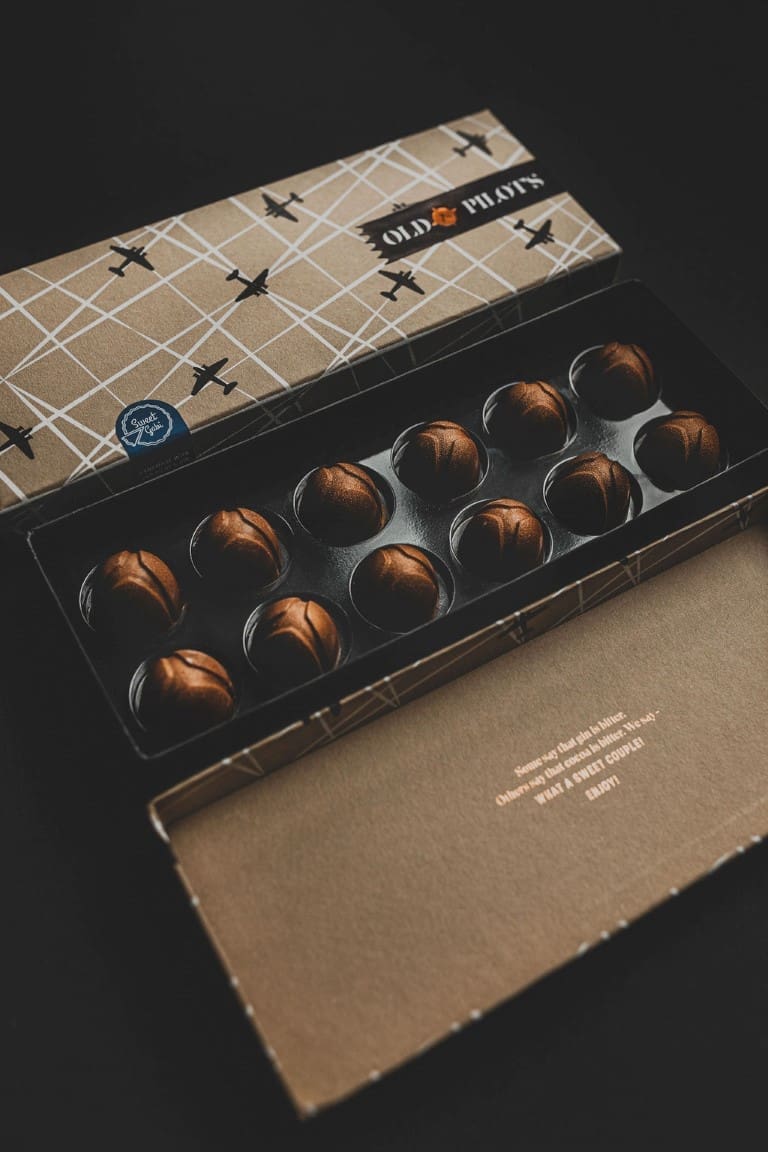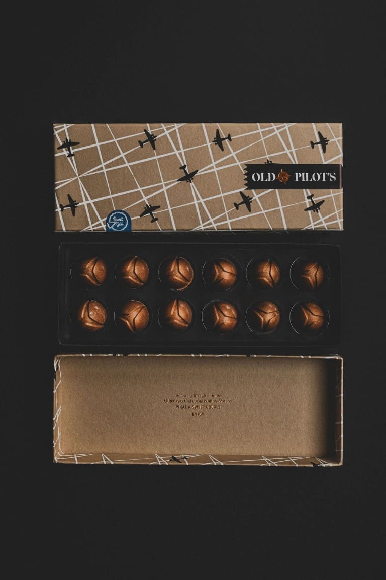 Razne kombinacije okusa s Old Pilot’s ginom proizvedene su najmodernijim tehnikama pripreme čokoladnih bombona, a garantirano će pružiti ultimativni gastro užitak čak i najzahtjevnijim čokoljupcima. Chozen je, pri izradi pralina, koristio Old Pilots Barrel Aged i London Dry gin, kako bi stvorio tri neodoljiva okusa. Praline od badema odlično pašu uz London Dry, dok original mliječna čokolada izvlači najbolje iz Barrel Aged. Tu je i karamelizirana mliječna čokolada za dodatni slankasti “kick”.