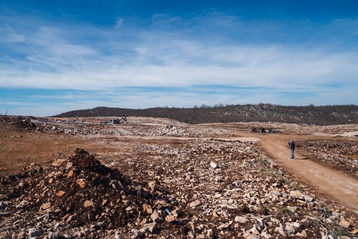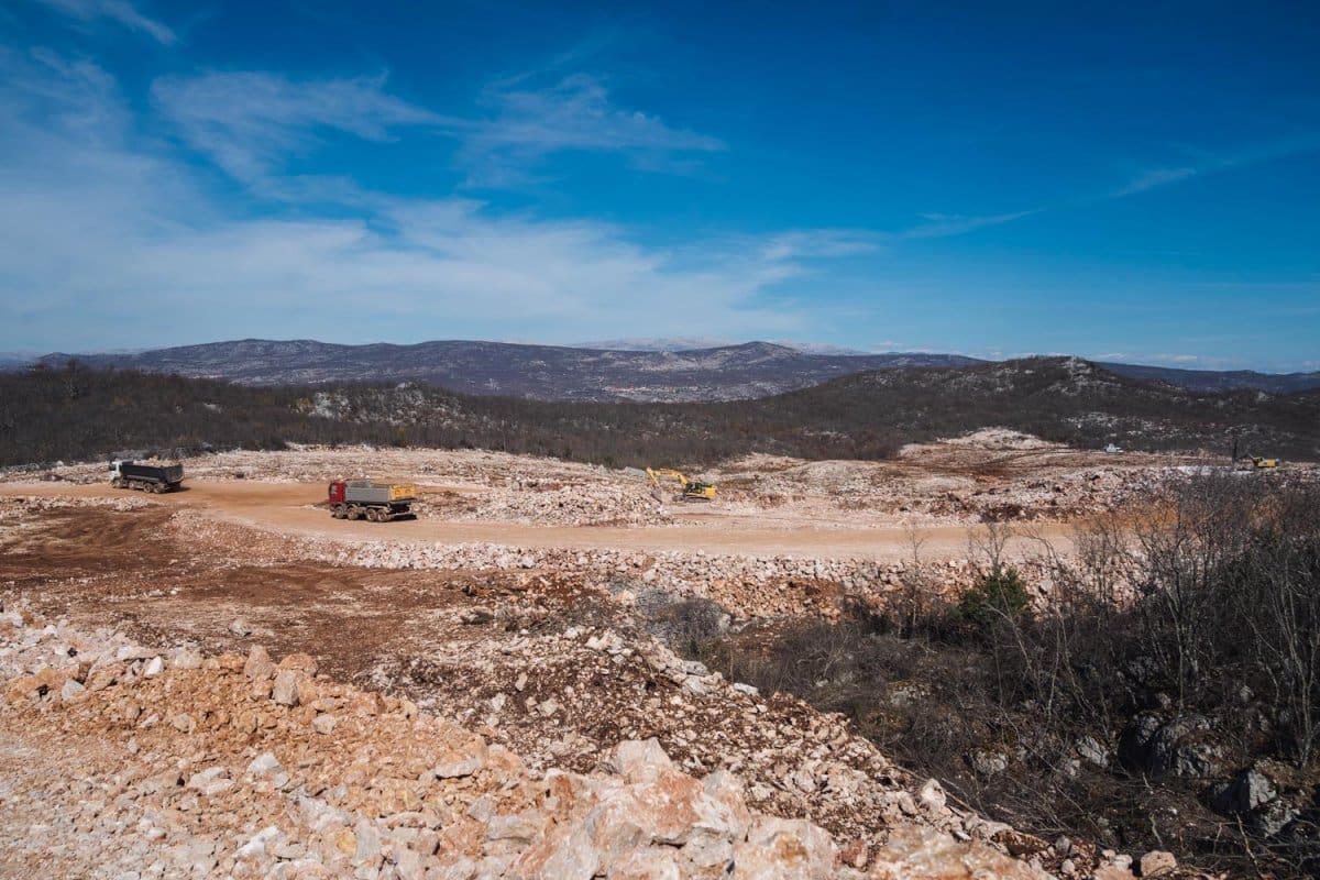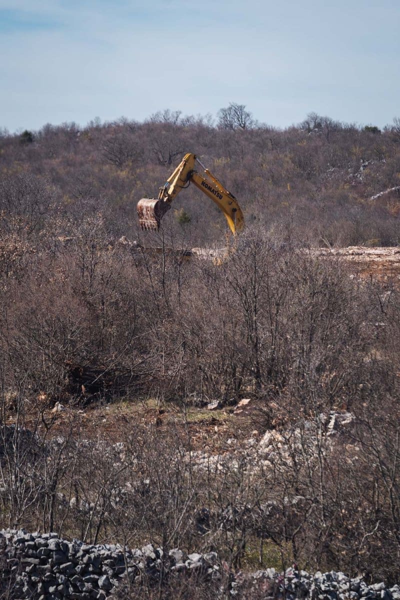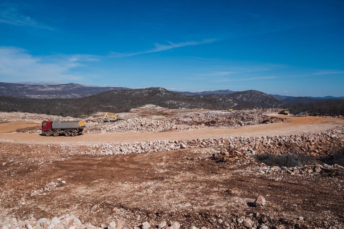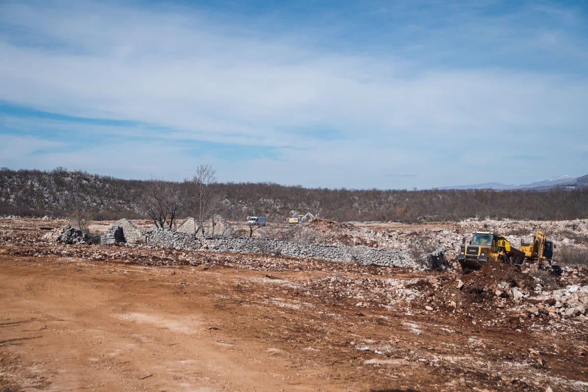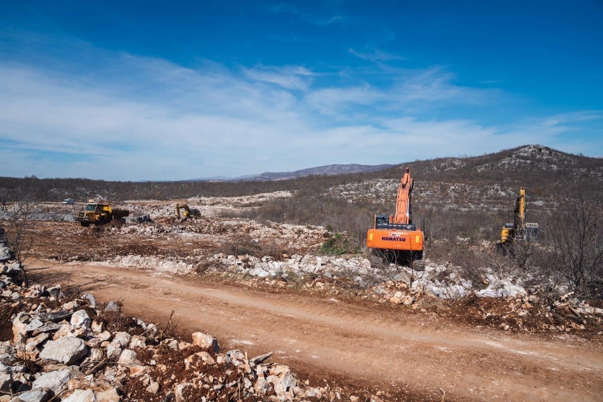 Mi pak nastavljamo dalje makadamskim putem dok kroz suhe grane u daljini vidimo prve kranove radnih strojeva: stotinjak metara dalje otvara nam se vidik, a škrto sivilo dalmatinskog grmlja zamjenjuje golema zaravan. Na njoj caruje teška mehanizacija: bageri u duetu s kiperima čiste kamenjar, nekoliko manjih strojeva nalik rovokopačima rade rupe u zemljištu ostavljajući gomile malih stožaca fine kamene prašine, kamioni, kombiji, poznata kakofonija velikog gradilišta.