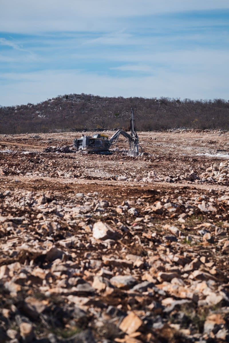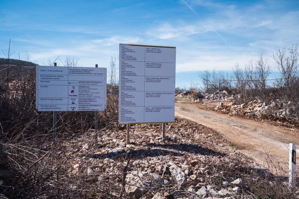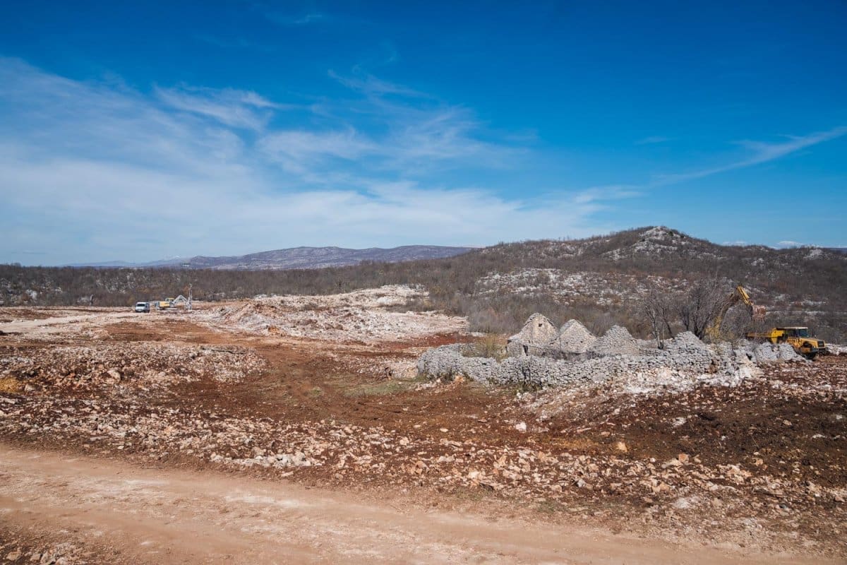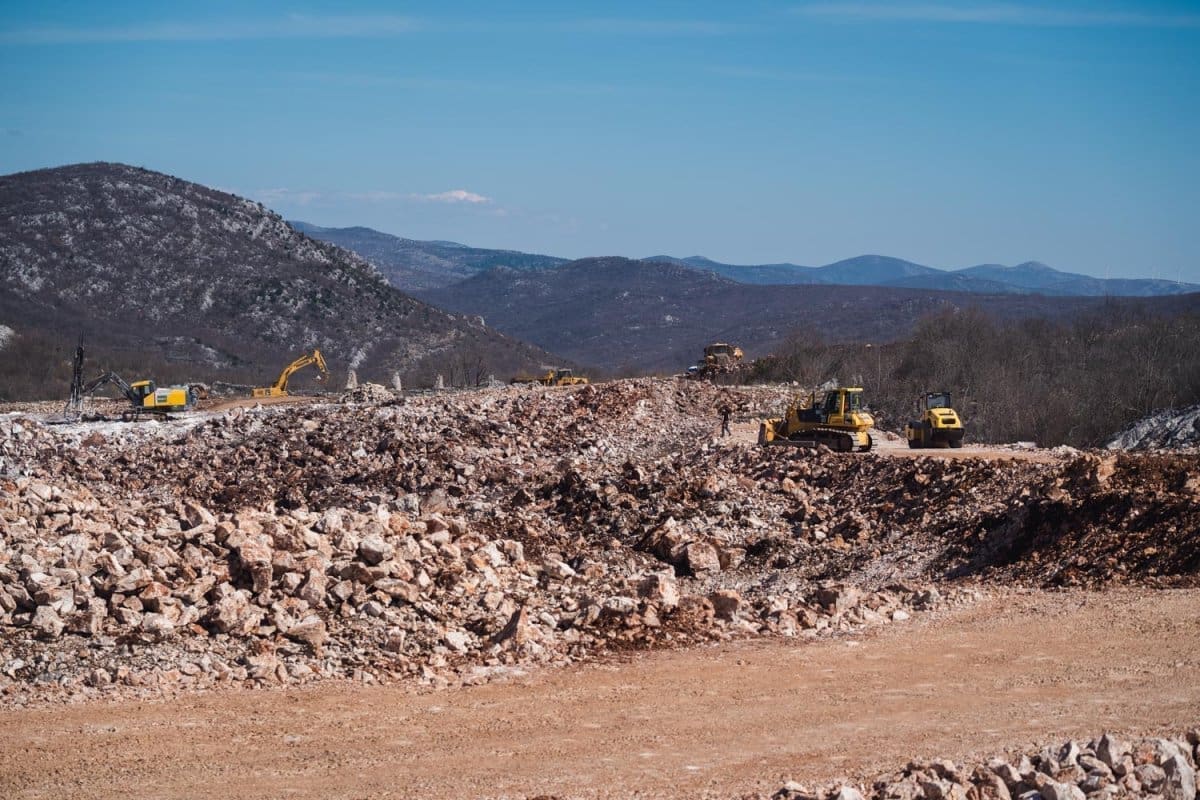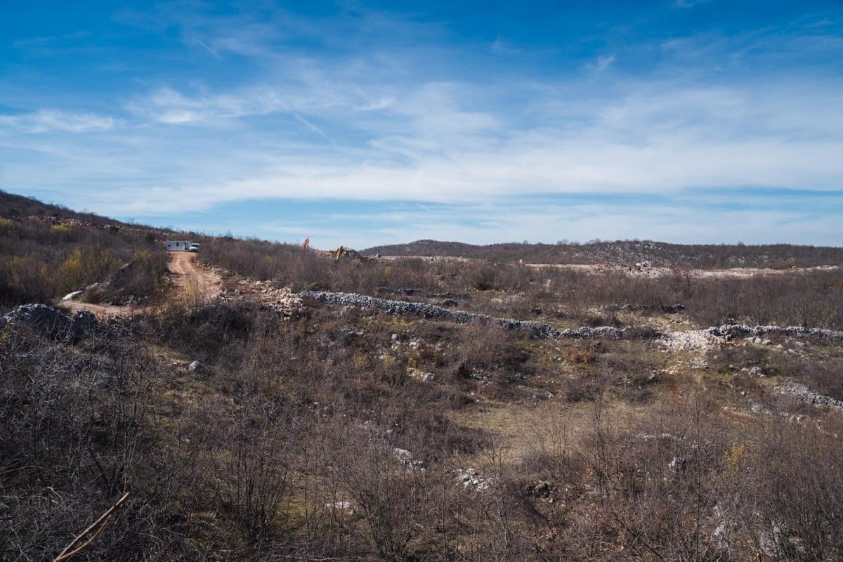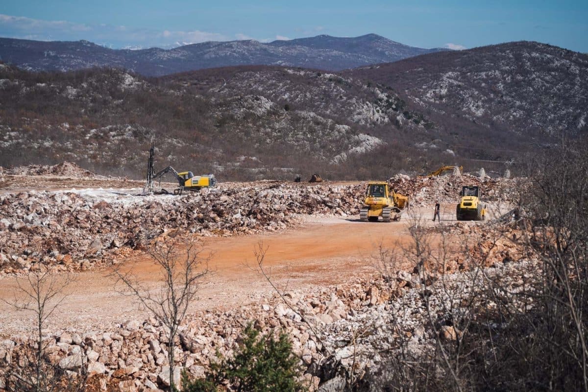 Mi pak nastavljamo dalje makadamskim putem dok kroz suhe grane u daljini vidimo prve kranove radnih strojeva: stotinjak metara dalje otvara nam se vidik, a škrto sivilo dalmatinskog grmlja zamjenjuje golema zaravan. Na njoj caruje teška mehanizacija: bageri u duetu s kiperima čiste kamenjar, nekoliko manjih strojeva nalik rovokopačima rade rupe u zemljištu ostavljajući gomile malih stožaca fine kamene prašine, kamioni, kombiji, poznata kakofonija velikog gradilišta.