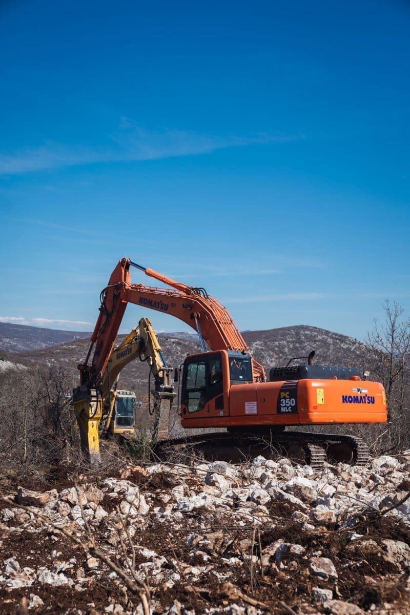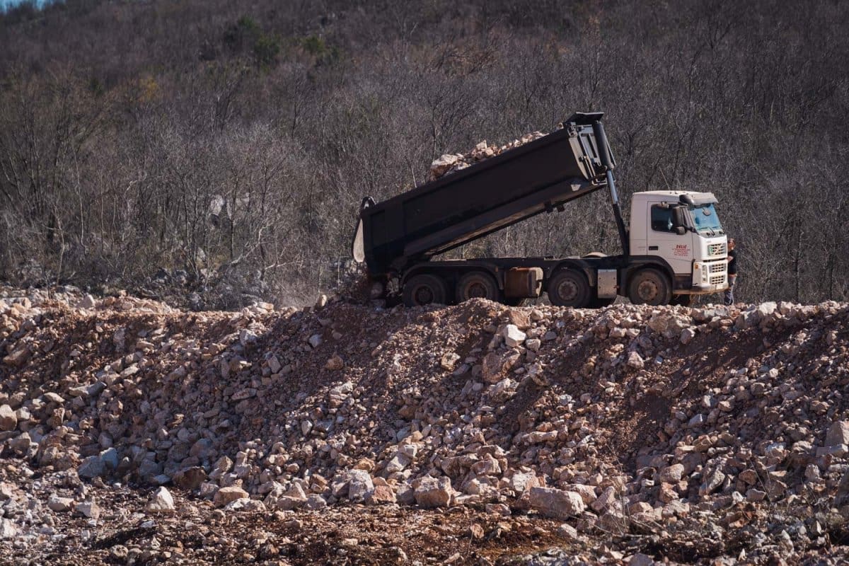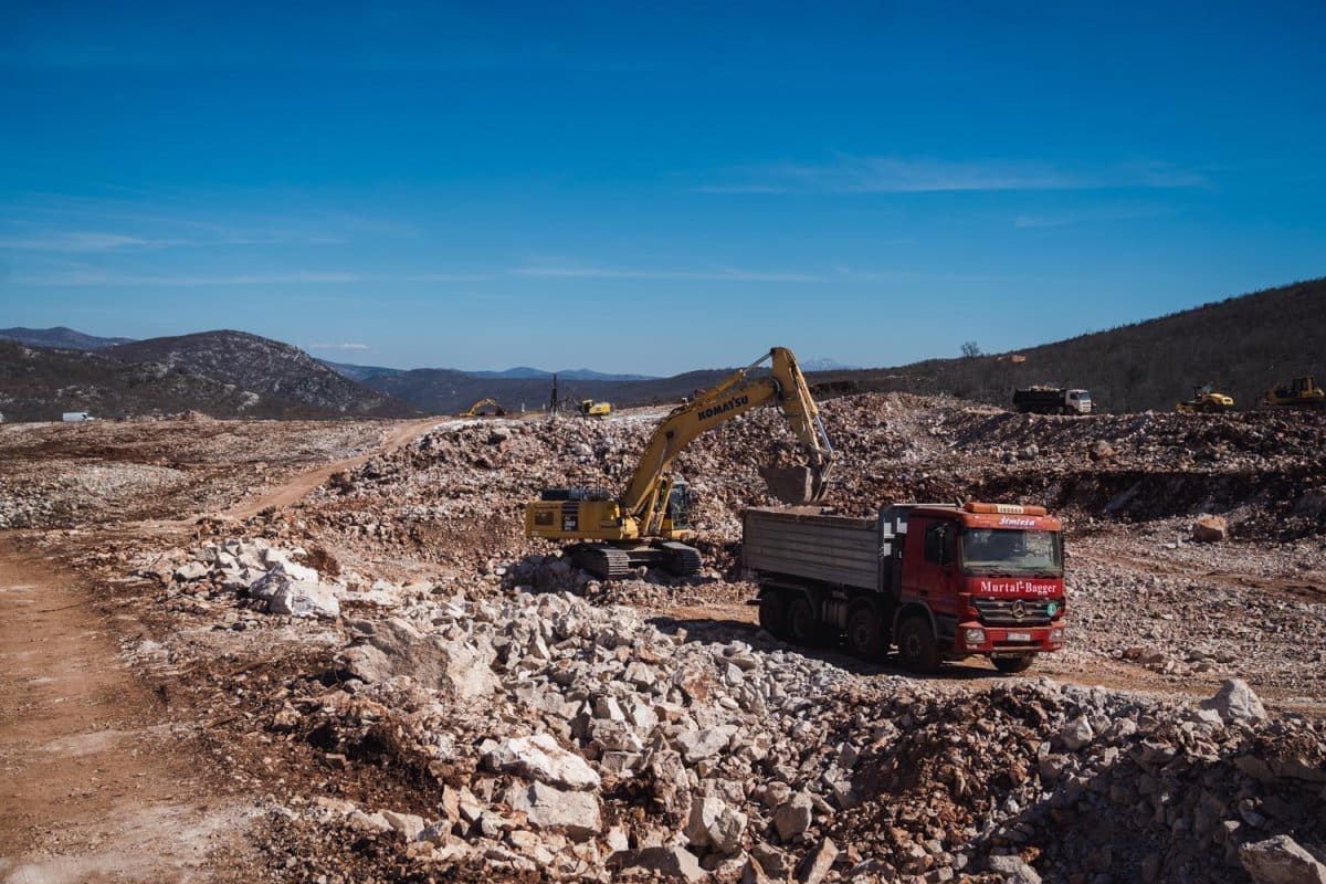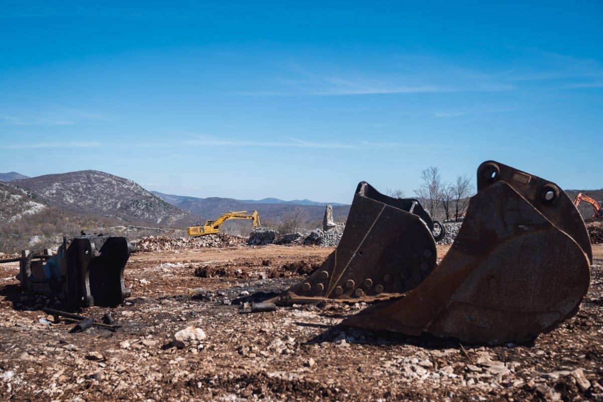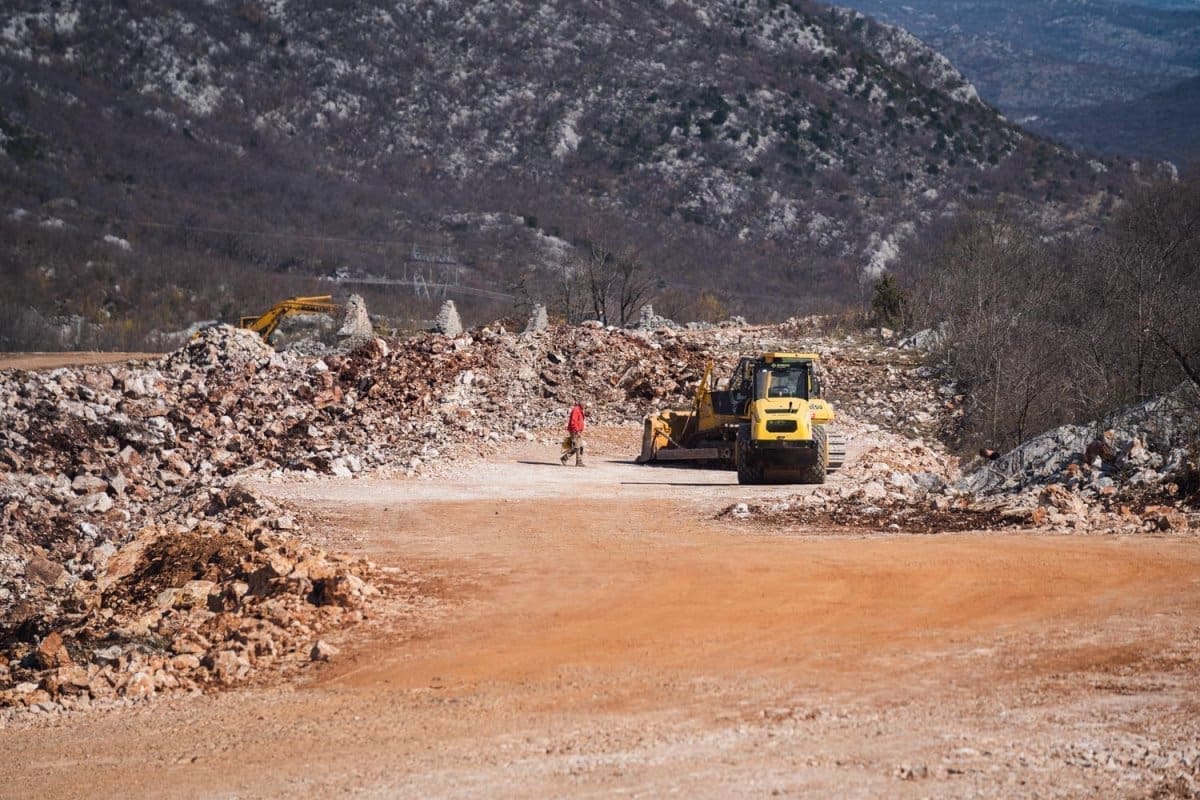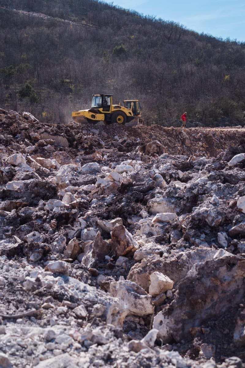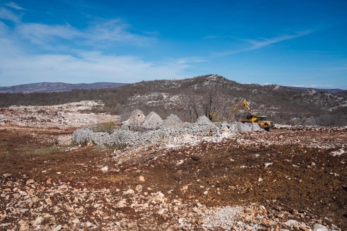 Mi pak nastavljamo dalje makadamskim putem dok kroz suhe grane u daljini vidimo prve kranove radnih strojeva: stotinjak metara dalje otvara nam se vidik, a škrto sivilo dalmatinskog grmlja zamjenjuje golema zaravan. Na njoj caruje teška mehanizacija: bageri u duetu s kiperima čiste kamenjar, nekoliko manjih strojeva nalik rovokopačima rade rupe u zemljištu ostavljajući gomile malih stožaca fine kamene prašine, kamioni, kombiji, poznata kakofonija velikog gradilišta.