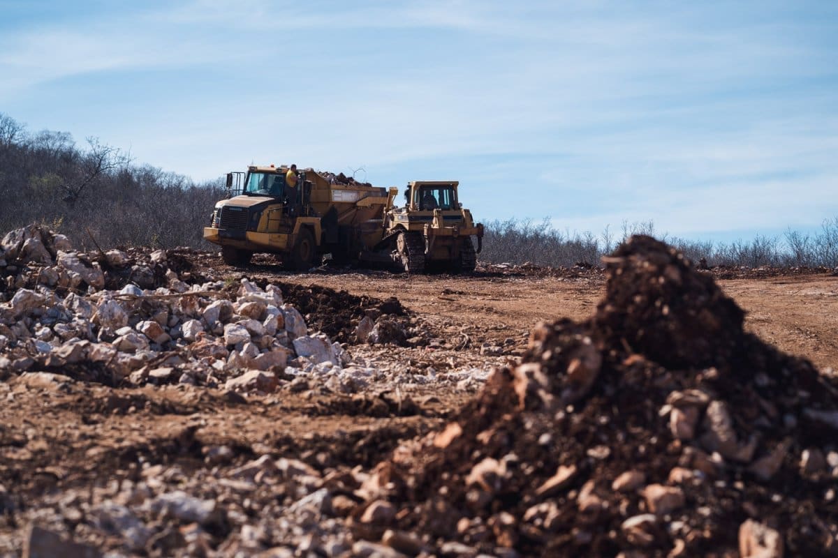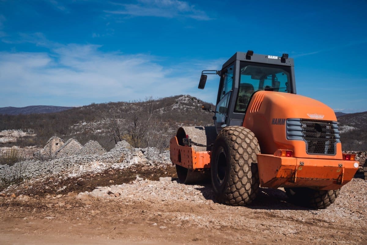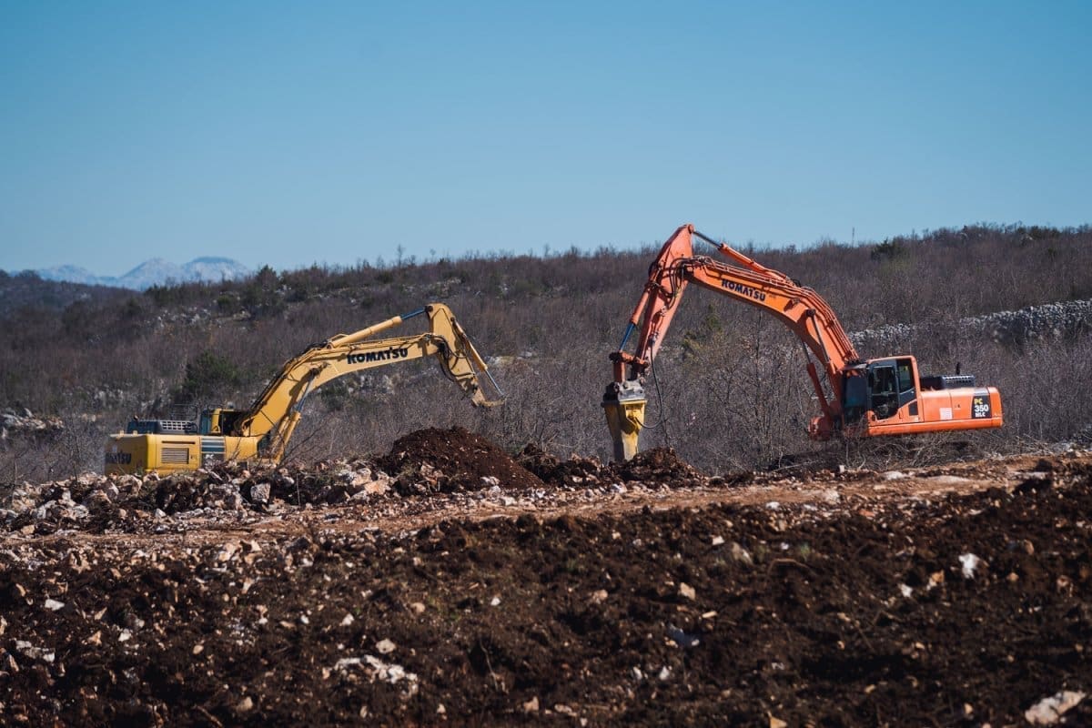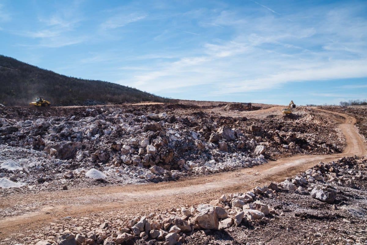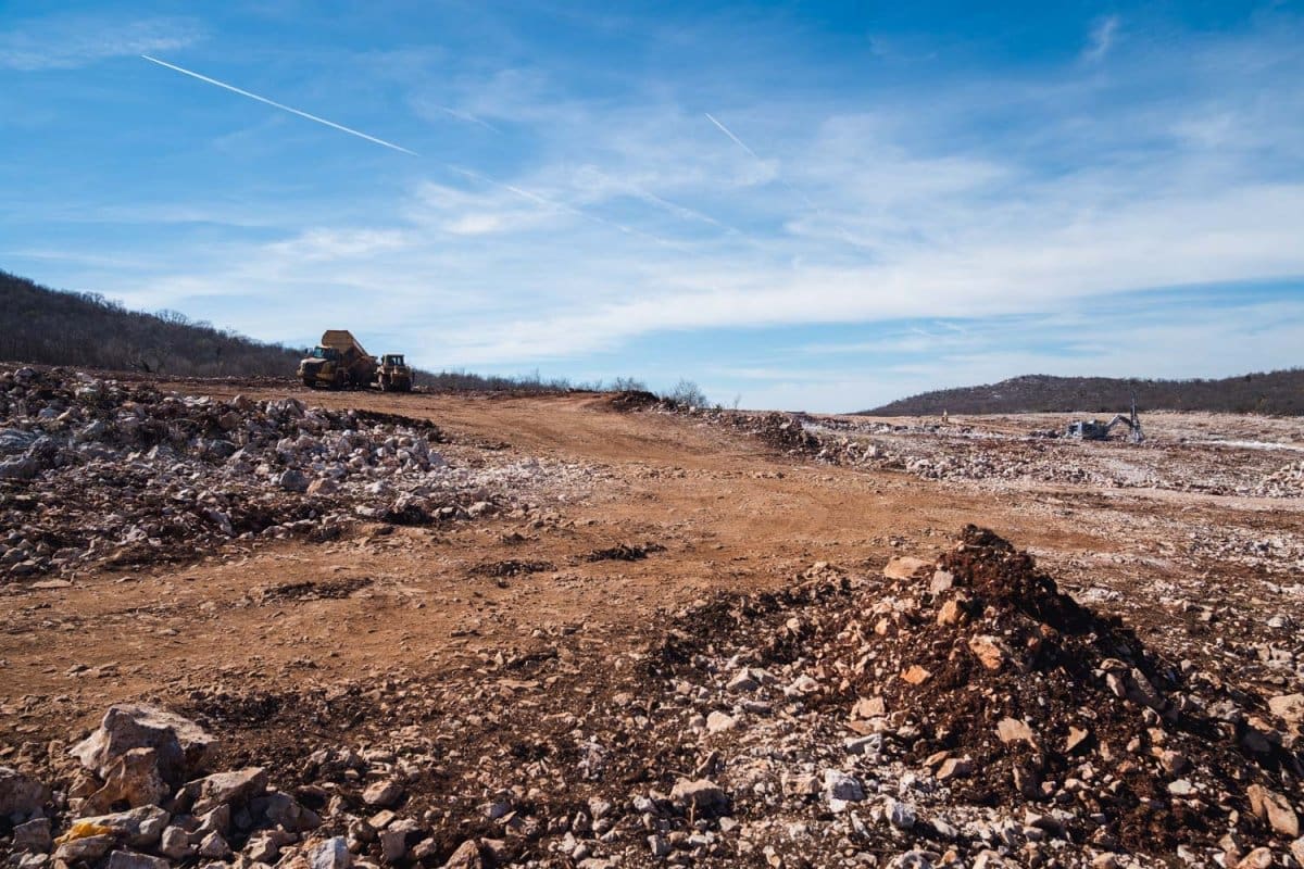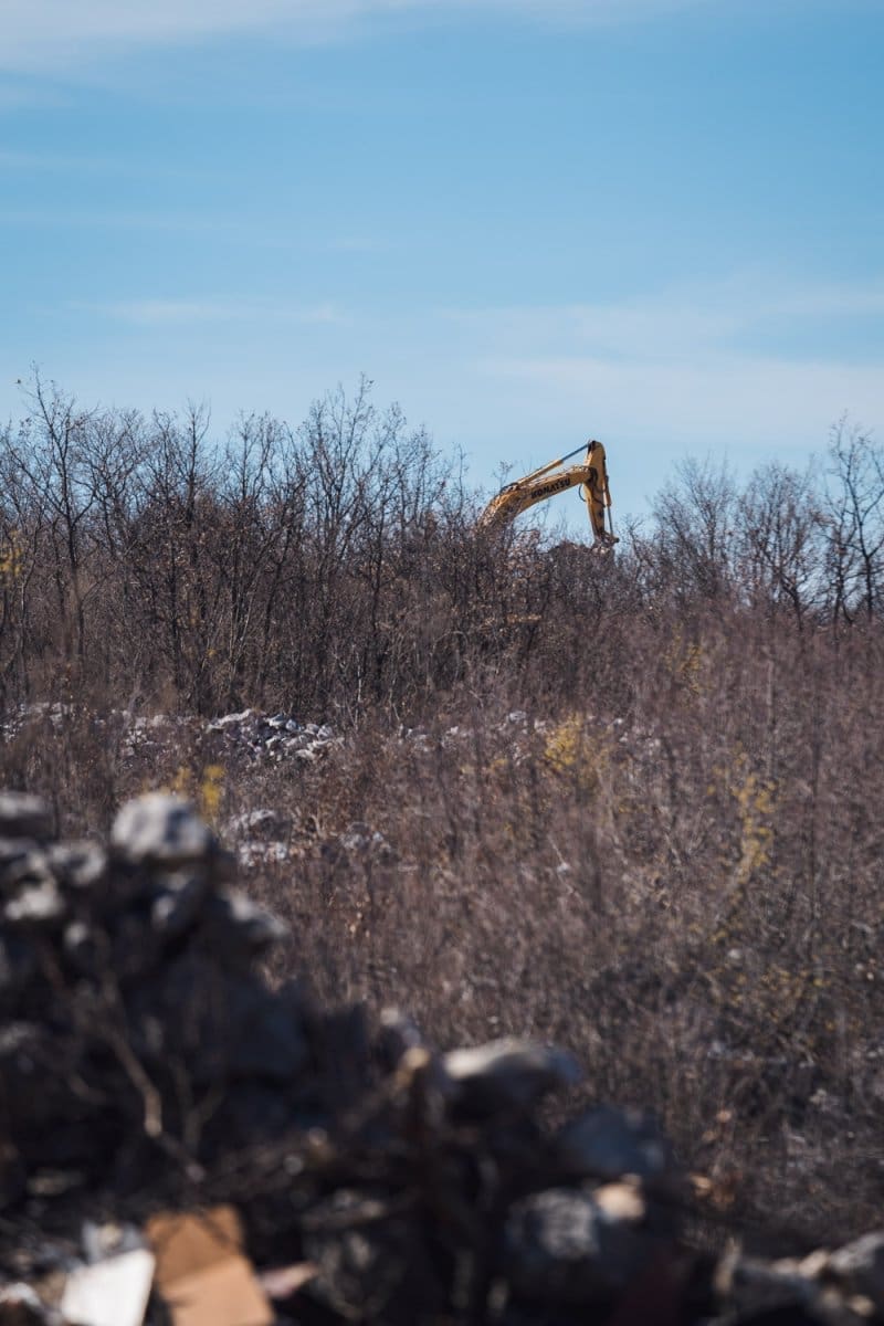 Mi pak nastavljamo dalje makadamskim putem dok kroz suhe grane u daljini vidimo prve kranove radnih strojeva: stotinjak metara dalje otvara nam se vidik, a škrto sivilo dalmatinskog grmlja zamjenjuje golema zaravan. Na njoj caruje teška mehanizacija: bageri u duetu s kiperima čiste kamenjar, nekoliko manjih strojeva nalik rovokopačima rade rupe u zemljištu ostavljajući gomile malih stožaca fine kamene prašine, kamioni, kombiji, poznata kakofonija velikog gradilišta.