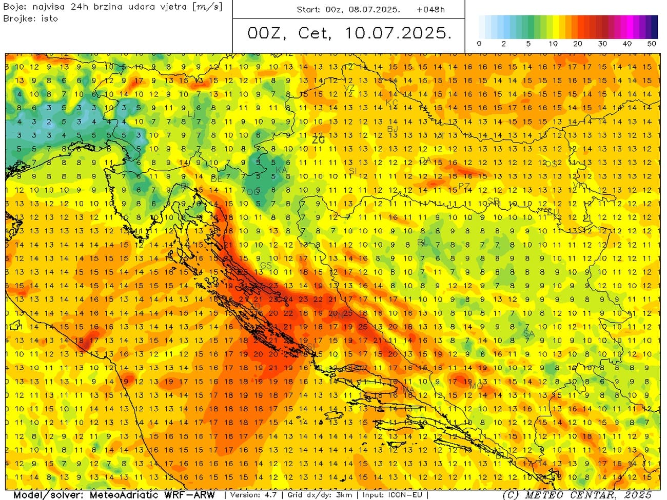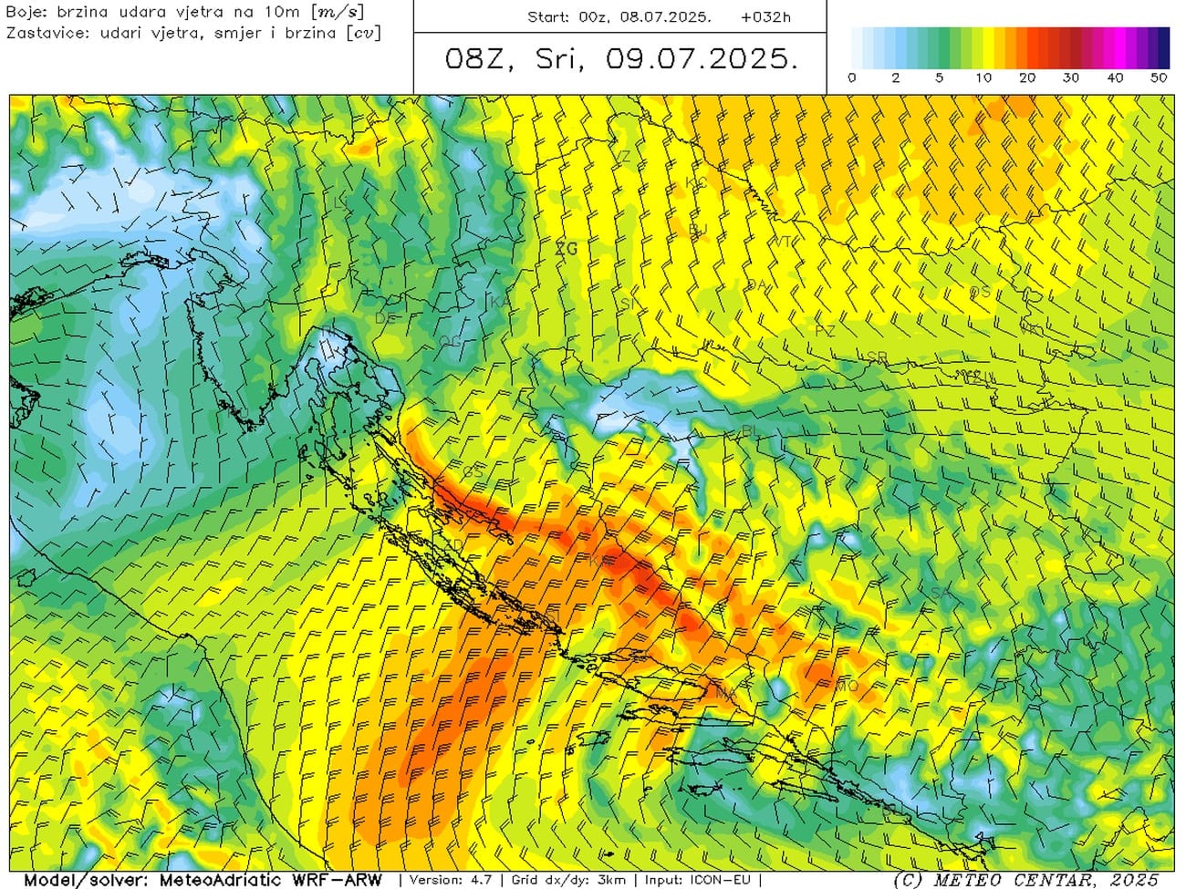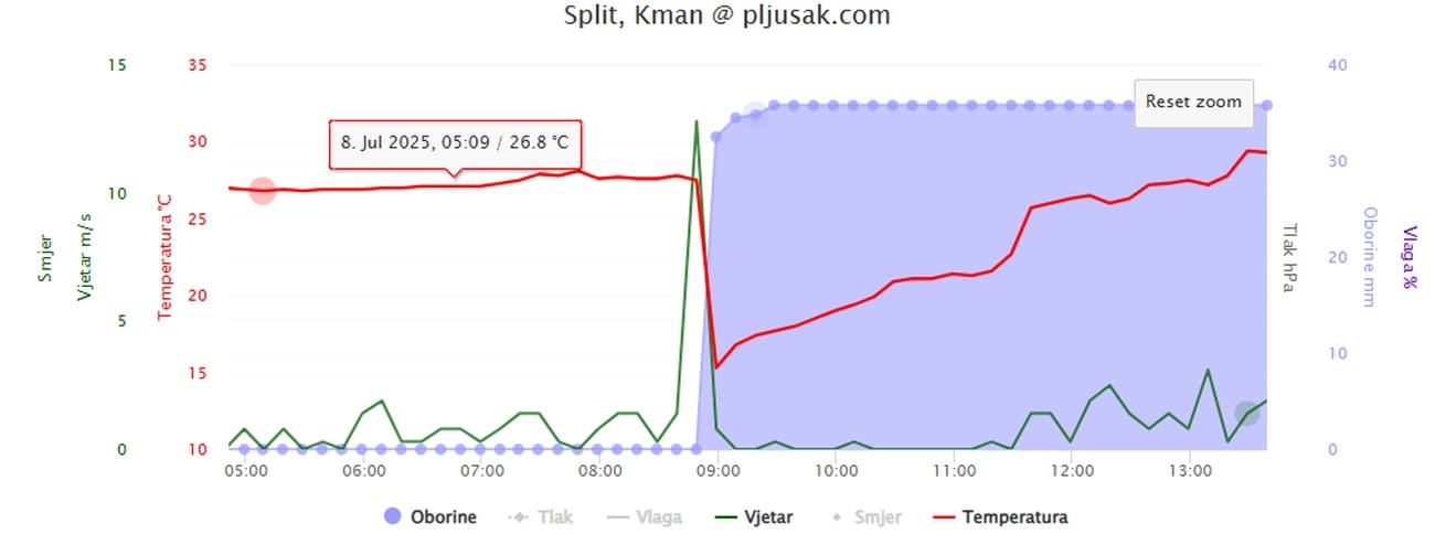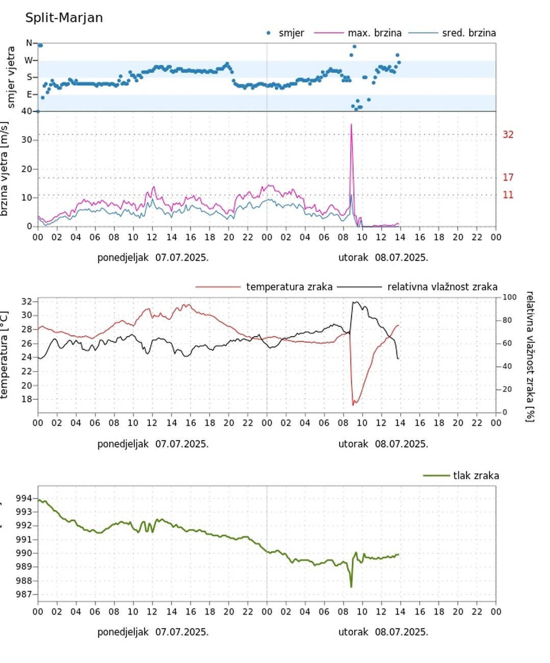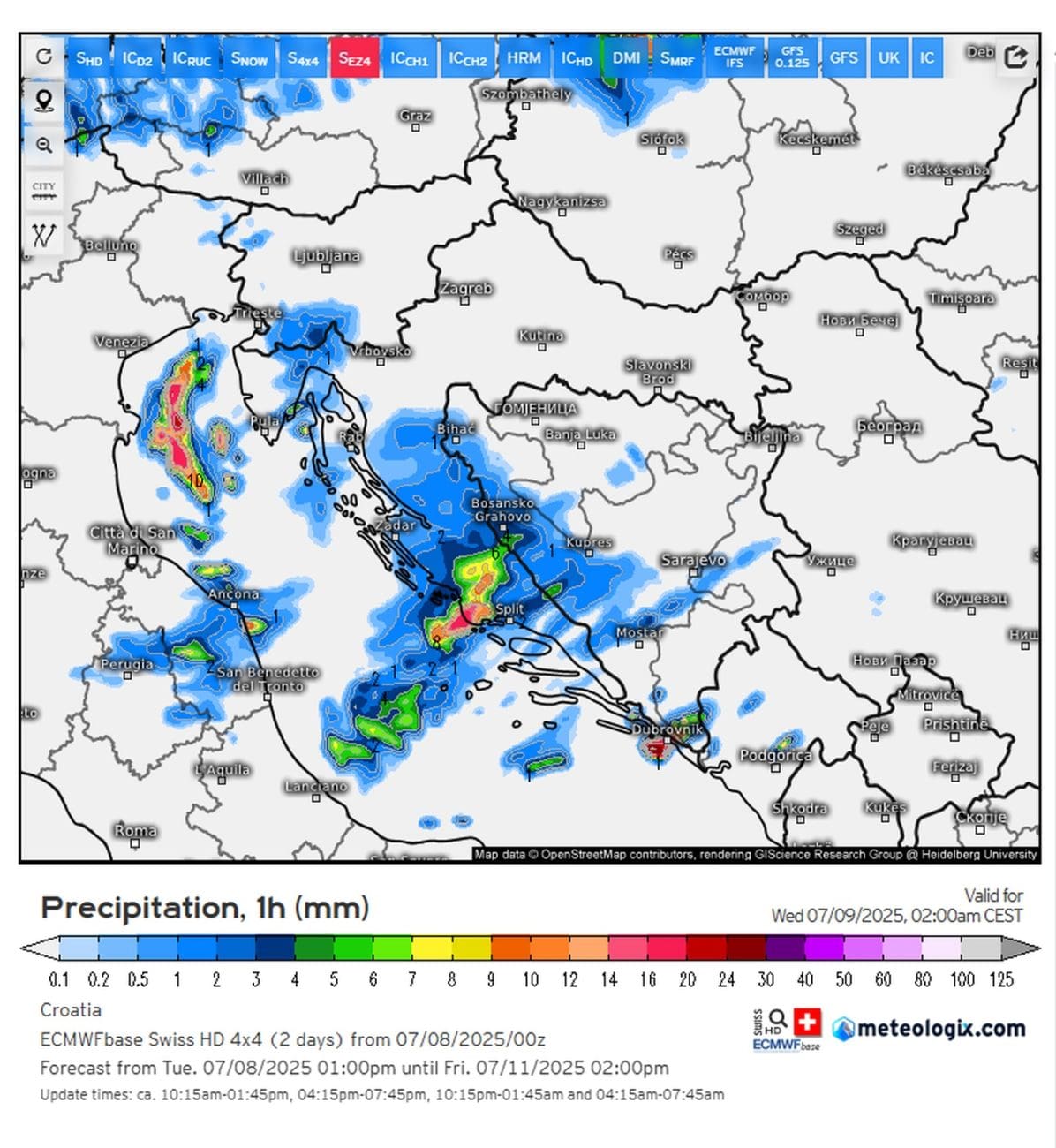 Sredinom noći novo naoblačenje s kišom, pljuskovima i grmljavinom prvo će zahvatiti sjevernu Dalmaciji, a tijekom noći proširit će se na ostatak. Lokalno je moguće jače grmljavinsko nevrijeme, ali prognostički modeli ne upućuju na ponavljanje jutrošnjeg scenarija u Splitu.