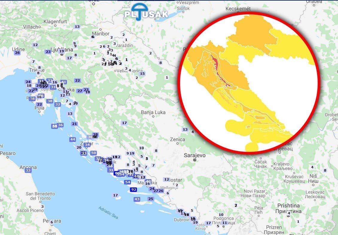 Obilnih oborina bilo je i drugdje, osobito u srednjoj Dalmaciji. Poljica kraj Marine primila su do 19 sati 80 litara kiše, a slijede Kaštel Štafilić 68, Milna Brač 54, Movarčica i Okruk Donji Čiovo 53, Postrana 52, Biograd na Moru 49, Lučice Brač 44 itd.