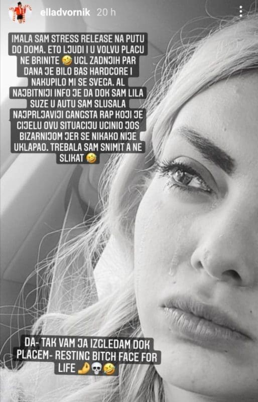 Ella Dvornik je na svojem InstaStoryju objavila fotografiju na kojoj plače. Fotografija je nastala u automobilu, a Ella je otkrila da joj se jednostavno nakupilo previše stresa i da je tako reagirala da putu kući.