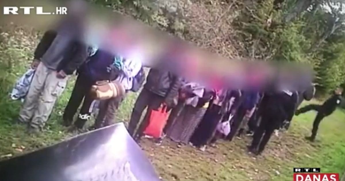 Pimjerice, ovo je snimka iz 2018. gdje se vidi policijsko postupanje na granici s Bosnom i Hercegovinom. Policajac s pištoljem naređuje kretanje migrantima u jednom redu, a drugi nogom odguruje migranta.