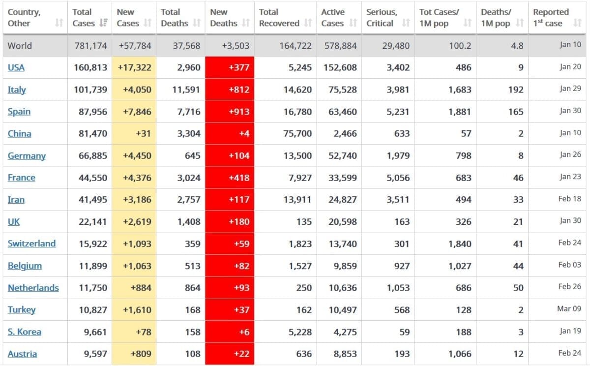 Objavljene su najnovije brojke vezane uz stanje s koronavirusom u svijetu. Tužne vijesti ovoga puta stižu iz Španjolske. Tamo je posljednja 24 sata od posljedica koronavirusa umrlo 913 ljudi, što je rekordan broj do sada. Očito je da se epidemija korone u Španjolskoj pogoršava, a tamo je od početka krize umrlo 7.716 ljudi. Posljednja 24 sata u Španjolskoj je evidentirano 7.846 novozaraženih, a od početka krize ih je evidentirano 87.956. Tijekom ponedjeljka 5.231 osoba je bila kritičnog zdravlja ili ozbiljno narušenog zdravlja. Ozdravilo je 16.780 ljudi.