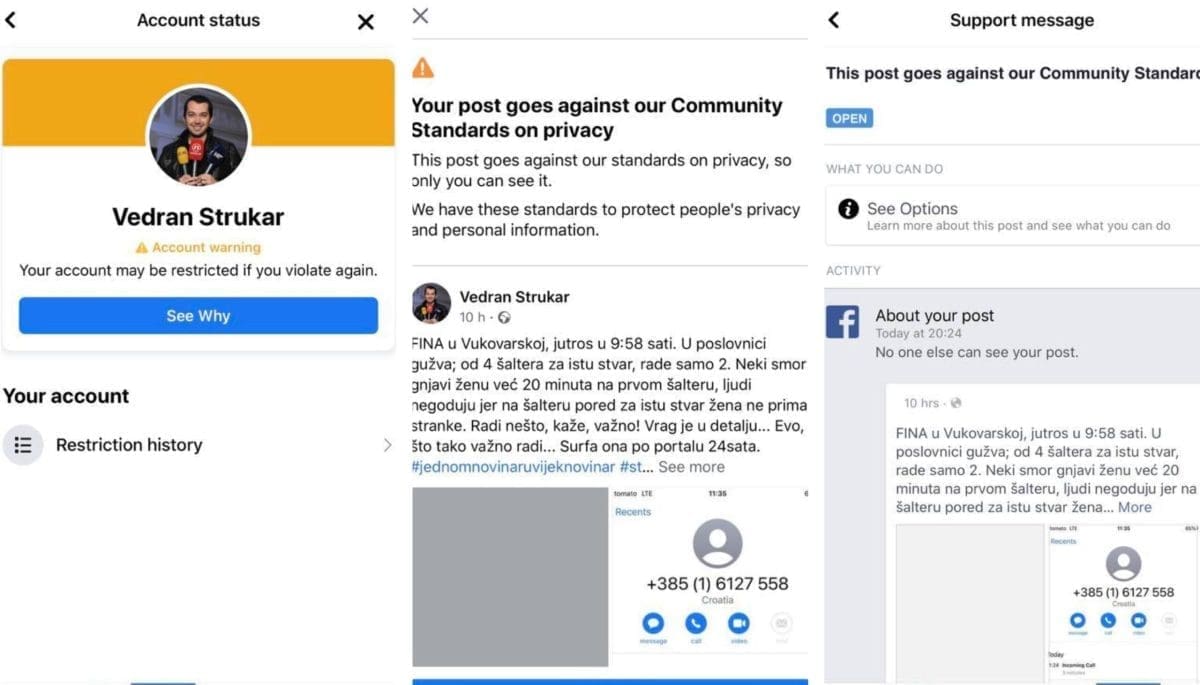 "Današnji status koji sam objavio o “doživljajima” iz Fine; poprimio je sasvim novu dimenziju. Umjesto da isprave svoj propust, i poprave radnu etiku nekih svojih zaposlenika, FINA me prijavila Facebooku za kršenje pravila korištenja i ugasili su mi post. Odmah sam se žalio čim sam otvorio tu obavijest i prilažem screenshootove. Čekam reply Facebooka na moju žalbu i osporavanje te prijave. Ako mi sad ugase profil, znate zašto. Nevjerojatno!!!"