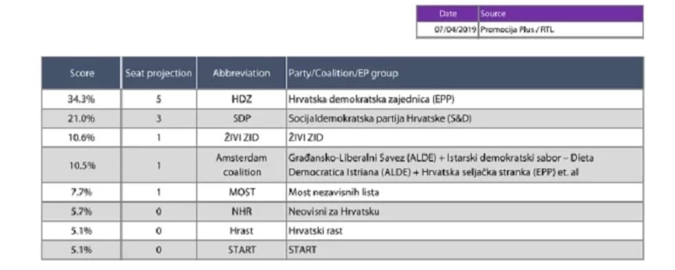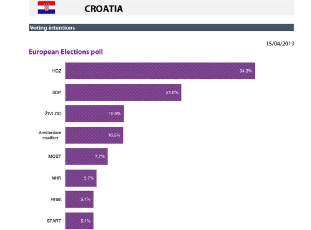 U tom kontekstu, HDZ osvaja pet mandata iako se on u opciji gdje Hrvatska bira i 12. zastupnika borio za šesti mandat. Prema ovom istraživanju HDz osvaja 34,3 posto glasova.
