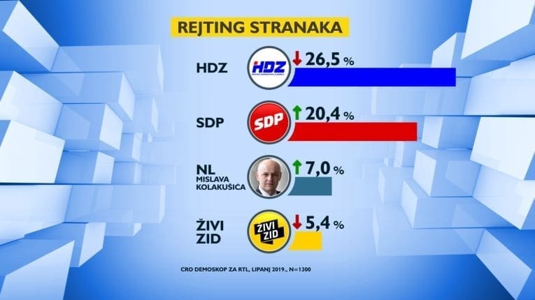 Da su parlamentarni izbori provedeni početkom lipnja (cijela Hrvatska jedna izborna jedinica uz izlaznost 53-59%), HDZ bi i dalje bio relativni izborni pobjednik, no bilježe pad potpore. Bira ih 26,5 posto ispitanika (prema 27,3 posto iz svibnja), što jest više nego što su osvojili na EU izborima, ali treći mjesec zaredom potpora im pada. Stožerna je stranka vladajuće koalicije u negativnom trendu već pet mjeseci, a ovomjesečna je izborna potpora vodeće stranke najslabija još od kolovoza prošle godine.