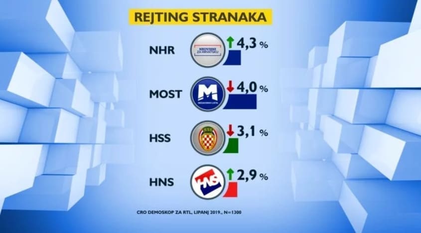 Raste stranka Brune Esih i Zlatka Hasanbegovića. Neovisne za Hrvatsku bira 4,3 posto ispitanika (prema 3,8 posto iz svibnja). Most je tek šesta opcija s 4 posto potpore, što je gotovo 3 postotna poena manje nego u svibnju (u svibnju 6,6 posto). Neznatno pada i HSS, na 3,1 posto (3,3 posto u svibnju), dok HNS, partner HDZ-a u vladi, blago raste, ali i dalje je daleko od praga s 2,9 posto (2,8 posto u svibnju).