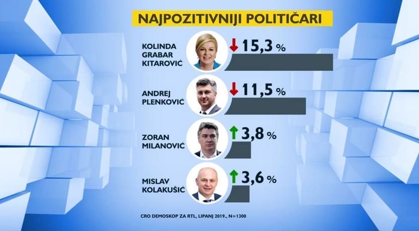 Na drugom je mjestu premijer Andrej Plenković s 11,5 posto (prije mjesec dana 12 posto). Iako politički neaktivan, bivši SDP-ov premijer Zoran Milanović je treći izbor s 3,8 posto (prema 3,5 posto iz svibnja). To je nešto više od zvijezde EU izbora, bivšeg suca Mislava Kolakušića koji istodobno ima ambicije za gotovo sve političke pozicije u državi. On je četvrti izbor s 3,6 posto (u svibnju 2,8 posto).
