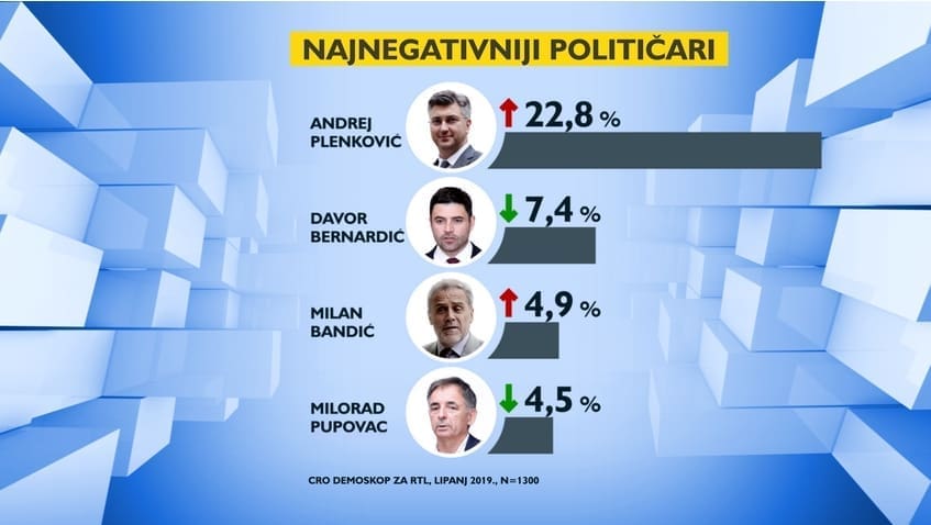Na vrhu ljestvice najnegativnijih domaćih političara i dalje je premijer Andrej Plenković, tako ga vidi nešto više ispitanika nego prošlog mjeseca. Da je aktualni predsjednik vlade najnegativniji političar, misli 22,8 posto ispitanika (u odnosu na 21,5 posto iz svibnja).