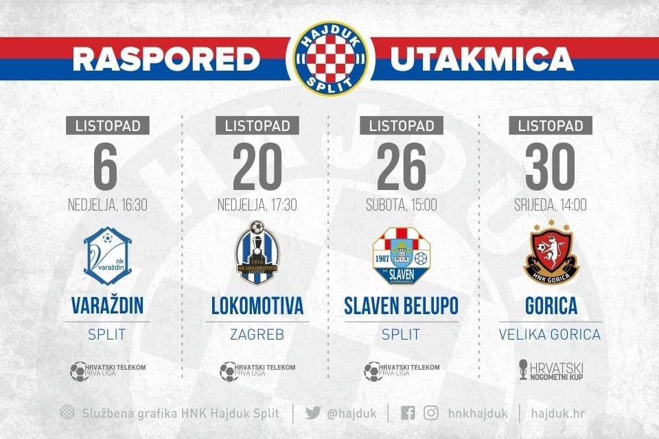 Hajdukovci će zatim u 13. kolu u subotu 26. listopada igrati protiv Slaven Belupa na Poljudu, a za kraj mjeseca ostaje gostovanje u Gorici, u srijedu od 14 sati u sklopu 1/8 finala Hrvatskog nogometnog kupa.