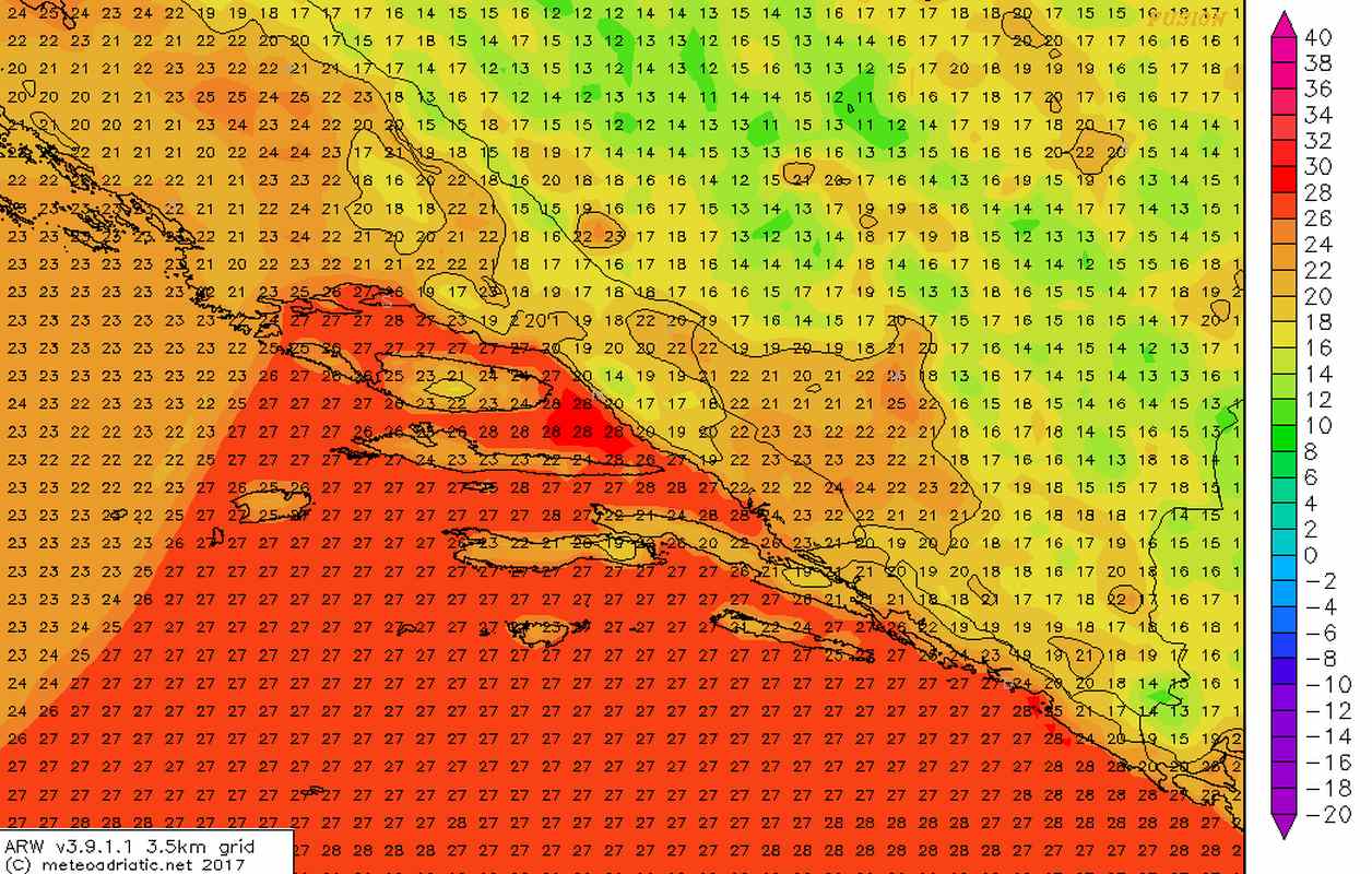 U srijedu pretežno sunčano, povremeno uz malu do umjerenu naoblaku. U većini predjela suho, uglavnom su u Zagori i na jugu Dalmacije mogući slabi pljuskovi. Noću tiho ili burin, danju će puhati slab maestral. Najviše dnevne temperature većinom od 29 do 33°C.
