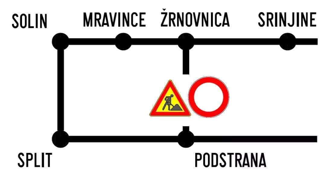 Za obilazni pravac određena je trasa preko županijske ceste ŽC 6270, tj. preko Solina, Mravinaca, Kučina, Korešnice i Žrnovnice i obratno.