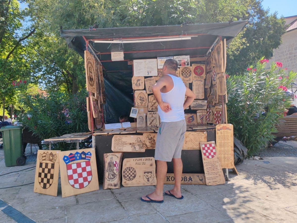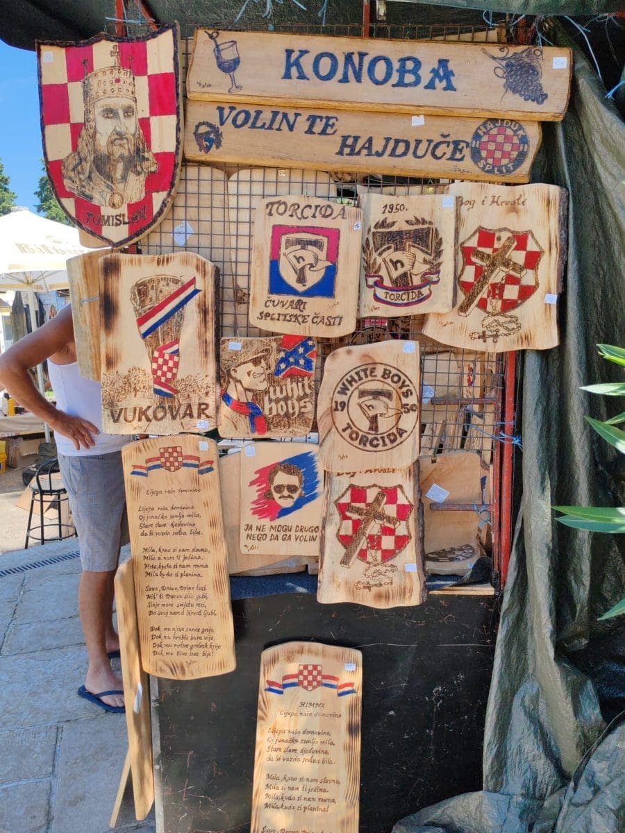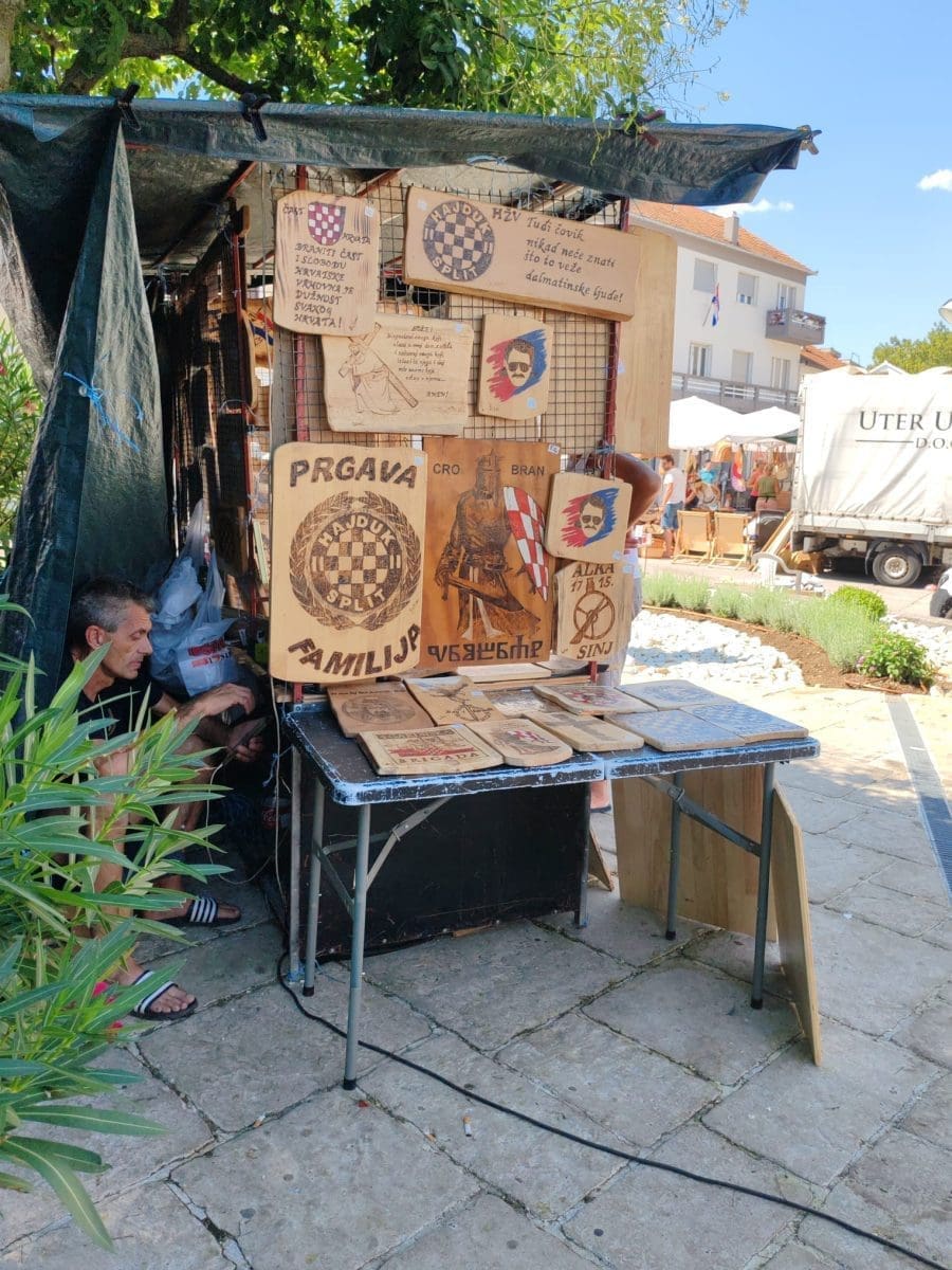 Naletjeli smo na jedan zanimljiv štand jednog obrtnika koji prodaje drvene motive koji su izrađeni u raznim oblicima i natpisima. Na tom štandu će se razveseliti i navijači i Hajduka i Dinama, ali i ljubitelji sinjske Alke, a doći će na svoje oni koji žele kupiti neki nacionalni simbol.