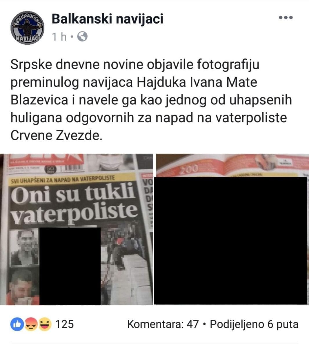 U dijelu srpskih medija, uglavnom tabloida sklonih žutilu, zadnjih se dana pojavilo puno lažnih vijest vezanih uz napad na vaterpoliste Zrvene zvezde u Splitu prošlog tjedna. Tako se po naslovnici Blica može pogrešno zaključiti da je jedan od napadača Ivan Mate Blažević, mladić koji je u kolovozu 2017. ubijen nožem u Stobreču. Blic je, naime, njegovu crno-bijelu fotografiju stavio na naslovnicu i to uz pogrešan identitet.