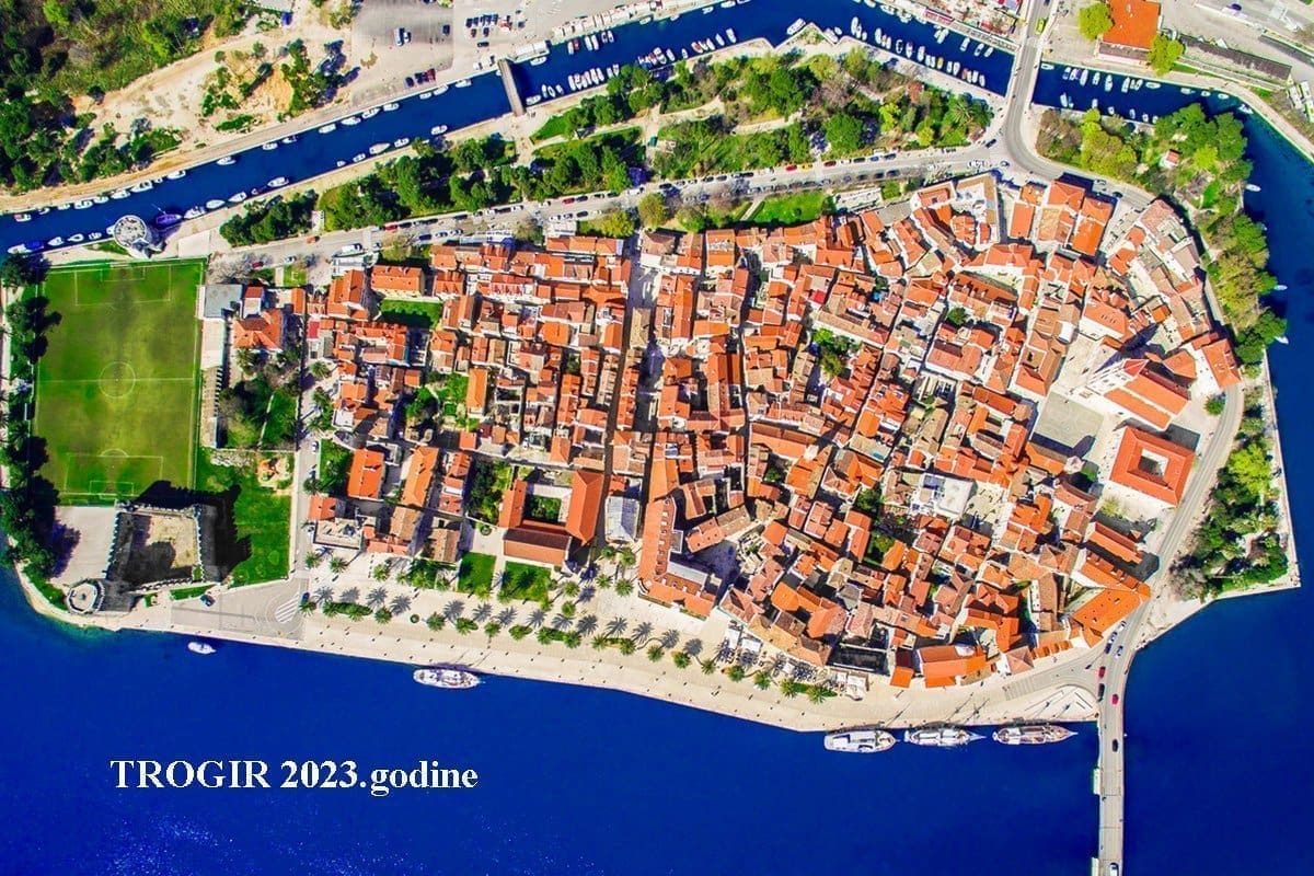 Prvi snimak je Trogir danas 2023. godine, drugi snimak je mletački tlocrt Trogira iz 1682. godine, a treća snimka je snimka današnje rekonstrukcije Trogira po mletačkom tlocrtu iz 1682. godine. Autor 3D modela rekonstrukcije je Stipan Ujdur iz Opuzena.