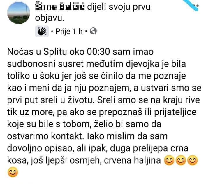 - Noćas u Splitu oko 00:30 sam imao sudbonosni susret međutim djevojka je bila toliko u šoku jer još se činilo da me poznaje kao i meni da ja nju poznajem, a ustvari smo se prvi put sreli u životu. Sreli smo se na kraju rive tik uz more, pa ako se prepoznaš ili prijateljice koje su bile s tobom, želio bi samo da ostvarimo kontakt. Iako mislim da sam dovoljno opisao, ali ipak, duga prelijepa crna kosa, još ljepši osmjeh, crvena haljina - napisao je.