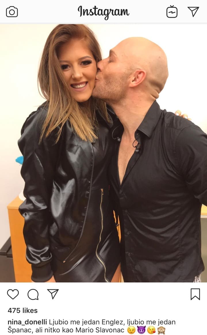 Ne vodeći baš previše računa da je Nina zauzeta, Mario ju je obgrlio iz sve snage i srčano poljubio. Uskoro je ta fotografija završila na Nininom Instagramu, a mlada pjevačica dodatno je sve 'posolila' parafrazirajući čuvenu stihove Lepe Brene: "Ljubio me jedan Englez, ljubio me jedan Španac, ali nitko kao Mario Slavonac" što je izazvalo pravu lavinu komentara na njezinom profilu.