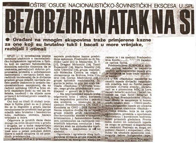 I tada, a evo i danas, građani su se pitali „Što se dogodilo u gradu slavne prošlosti kad grupe mladih tako brutalno i bezobzirno tuku, razbijaju, otimaju i bacaju vršnjake u more“. I tada, a evo i danas kao da su kopirani i zalijepljeni naslovi o bezobrazluku, nacionalizmu, šovinizmu i huliganizmu kojeg neki nazivaju fašistoidnima.