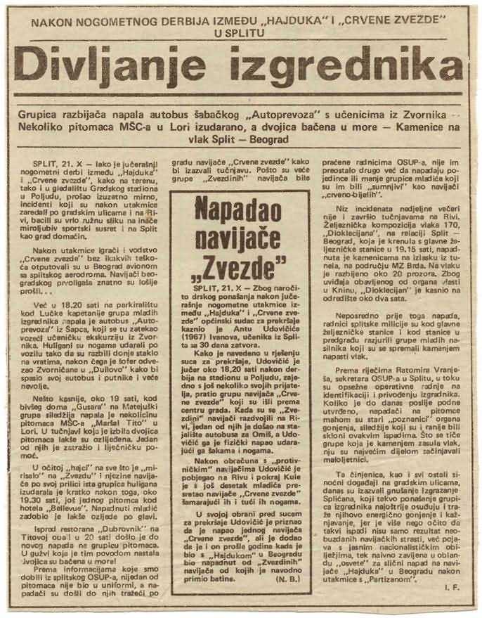I tada, a evo i danas, građani su se pitali „Što se dogodilo u gradu slavne prošlosti kad grupe mladih tako brutalno i bezobzirno tuku, razbijaju, otimaju i bacaju vršnjake u more“. I tada, a evo i danas kao da su kopirani i zalijepljeni naslovi o bezobrazluku, nacionalizmu, šovinizmu i huliganizmu kojeg neki nazivaju fašistoidnima.