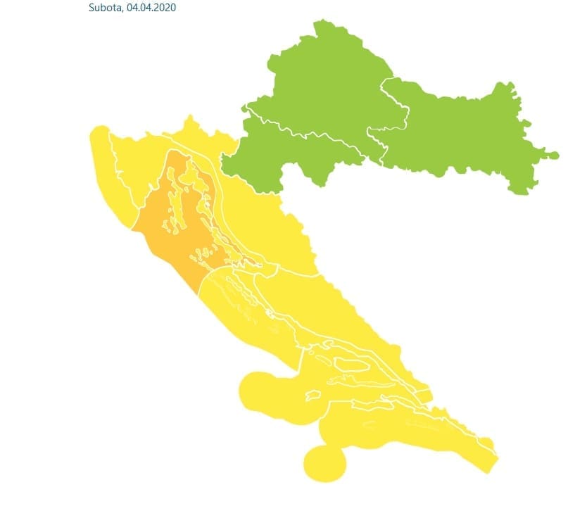 Danas nas očekuje pretežno sunčano vrijeme uz umjerenu do jaku buru. Bura će podno Velebita imati olujne udare preko 100 km/h, a pokoji olujni udar u noći na nedjelju moguć je i u Dalmaciji. Bit će osjetno toplije u odnosu na prethodne dane s najvišim dnevnim temperaturama od 16 do 21°C. DHMZ je, unutar sustava MeteoAlarm, izdao žuto upozorenje za veći dio Jadrana zbog bure s udarima do 90km/h, a za Podvelebitsko primorje i narančasti stupanj upozorenja.