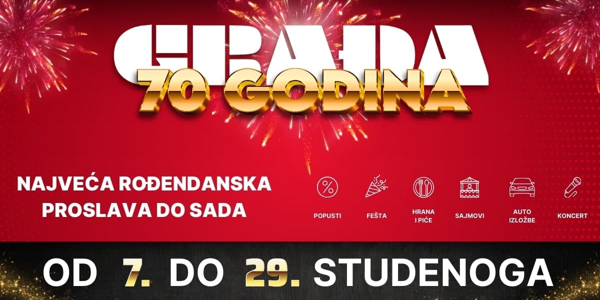 Najveća proslava godine događa se upravo u Građi! Povodom 70. rođendana, Građa organizira svoju najveću zabavu dosad. Od 7. do 29. studenoga očekuju vas ogromni popusti, velika fešta, sajmovi, kućice za evente i još mnogo drugog zabavnog sadržaja – sve to će se odvijati kroz čitav navedeni period!