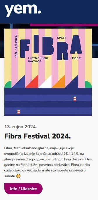 Objava je to na stranicama tvrtke Core event d.o.o. za prodaju ulaznica. Malo poviše još daju šansu ljudima da klikaju/tapkaju na Kupi ulaznice. I na stranicama organizatora Fibre 2024. YEM produkcije d.o.o. možete to isto iako je događaj koji je trebao početi večeras otkazan. Valjda je uredit stranicu na jednoznačan, nezbunjujući način skup, riskantan posao.