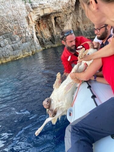 Stoga su se dva spašavatelja popela na stijenu, gurnula kozu u more te je životinja izvučena na brod i spašena', priopćili su iz HGSS-a.