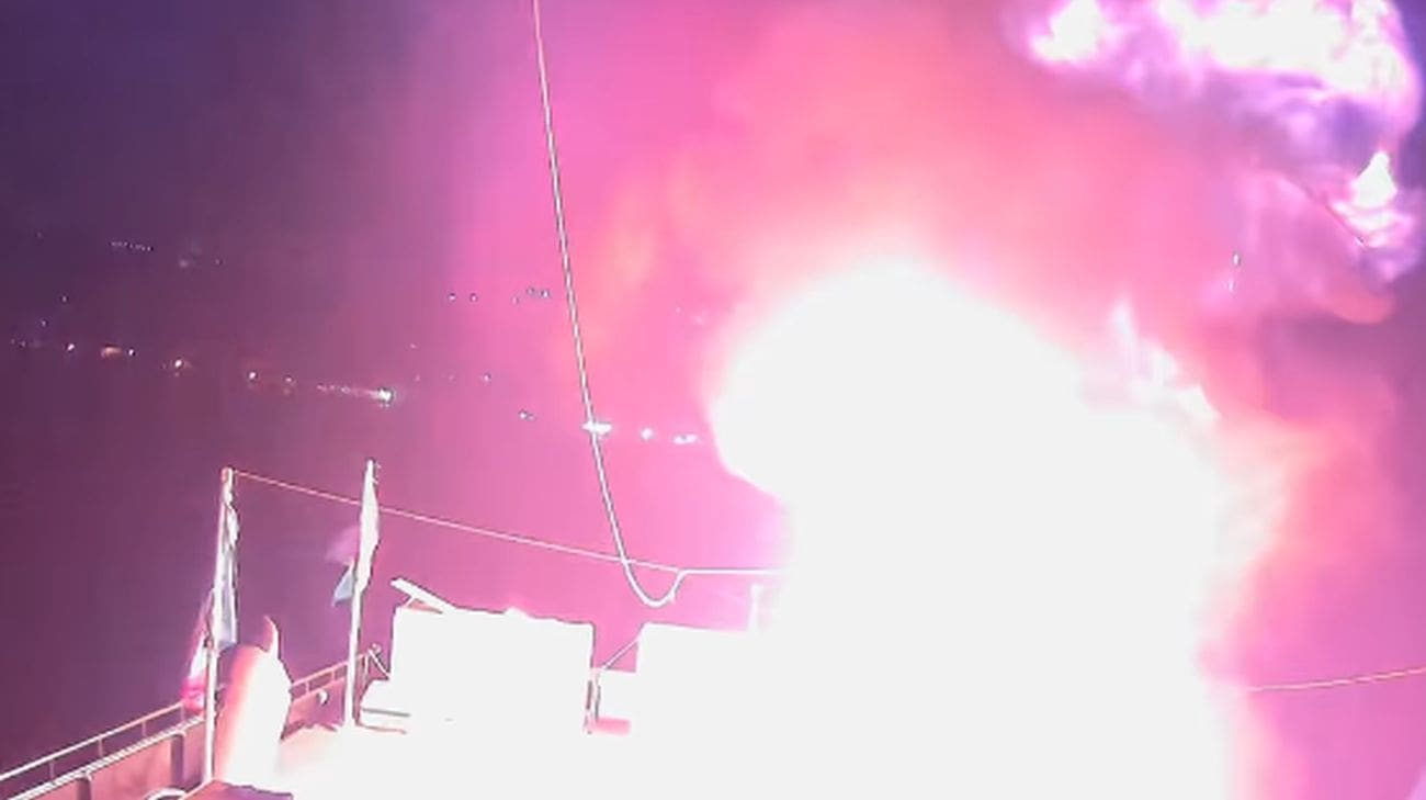Videozapis navodnog drugog incidenta prikazuje svijetli objekt odozgo koji udara u brod i ubrzo nakon toga izbija požar.